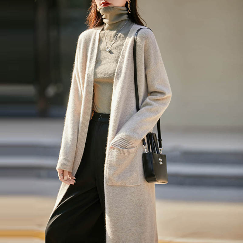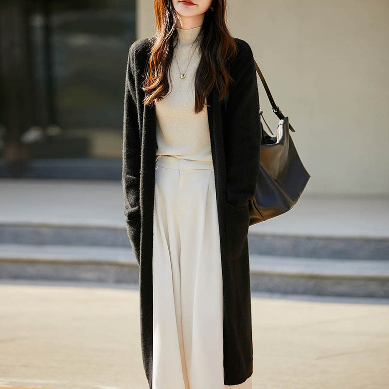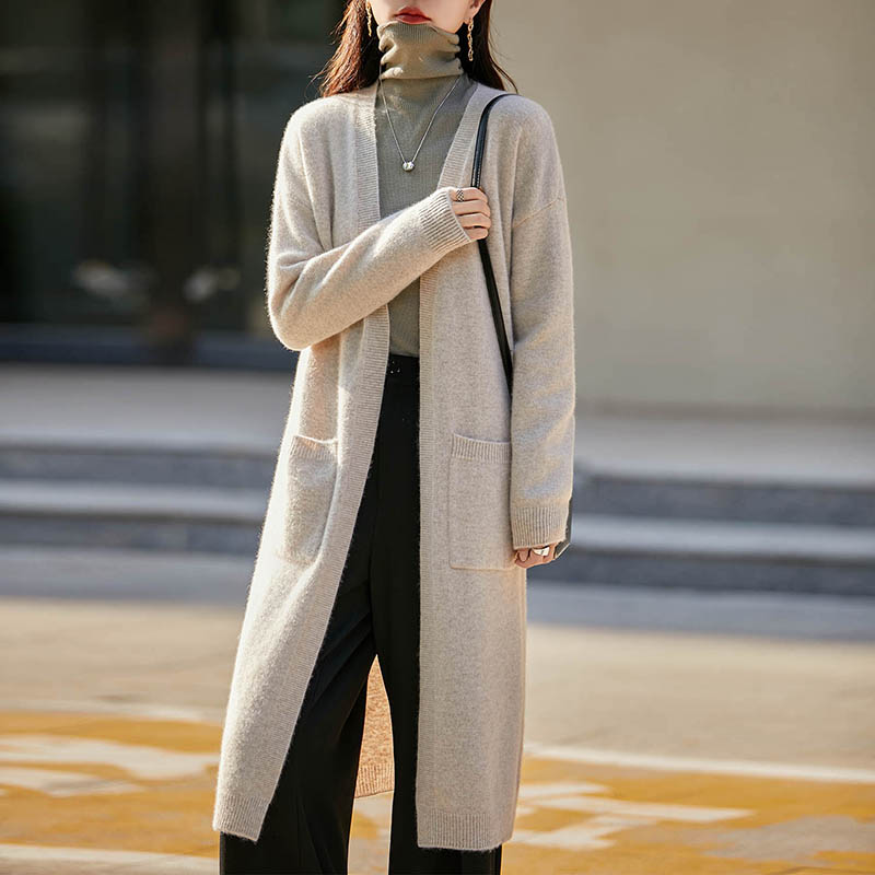 100%纯羊毛开衫女V领中长款针织毛衣外套宽松慵懒羊绒衫过膝外套