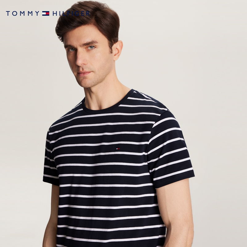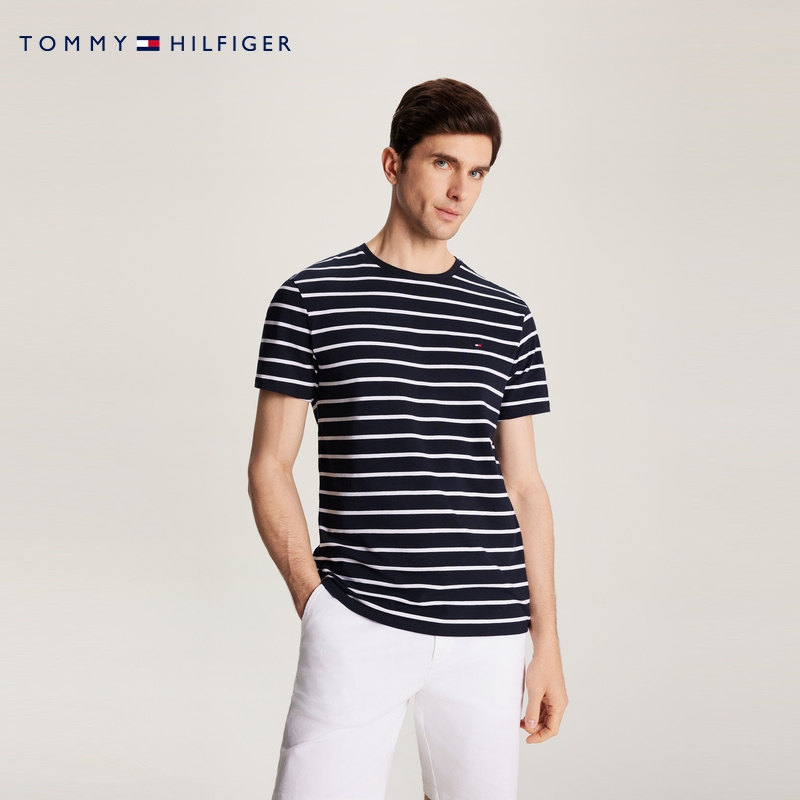 【条纹修身】Tommy春夏男装休闲通勤弹力圆领内搭打底短袖T恤上衣