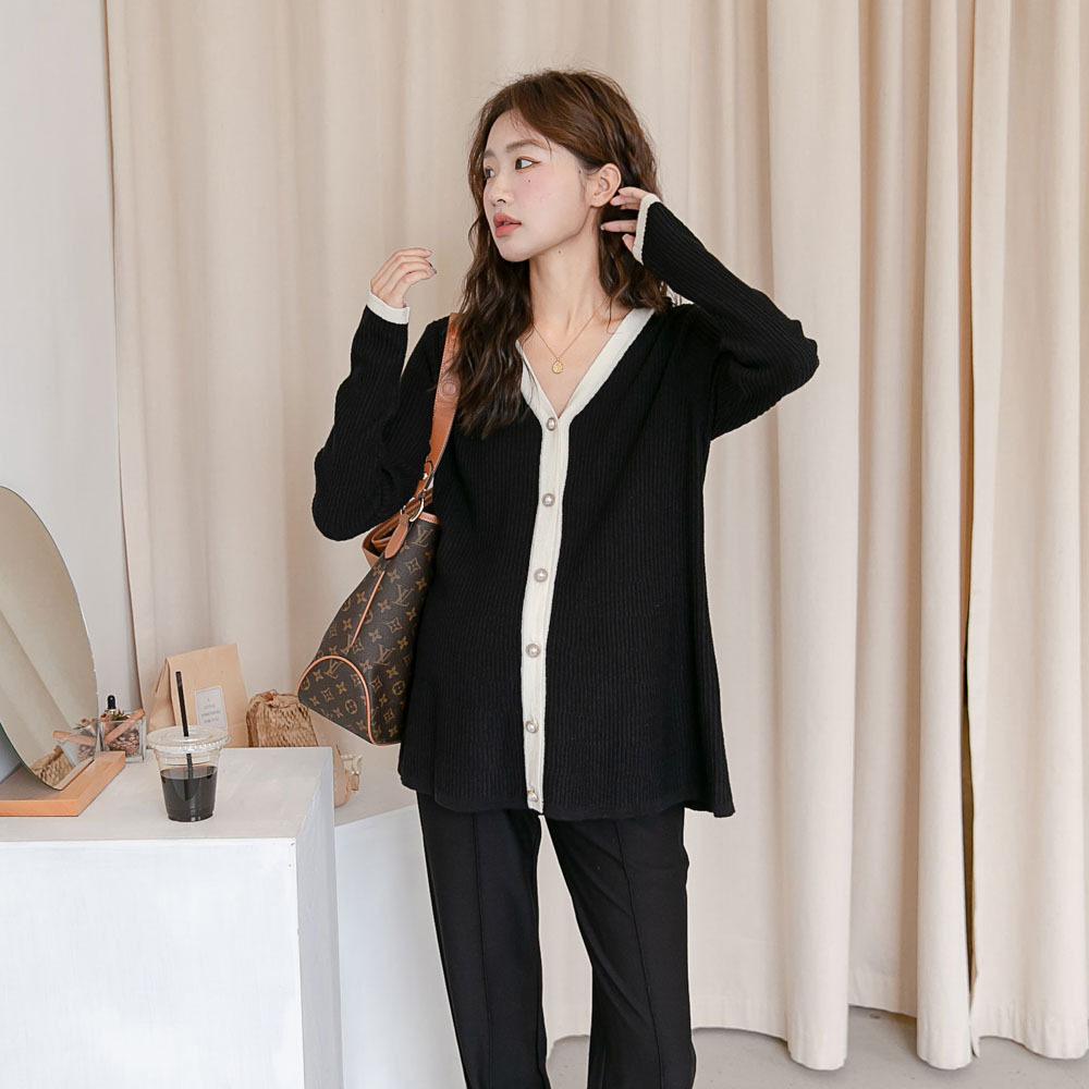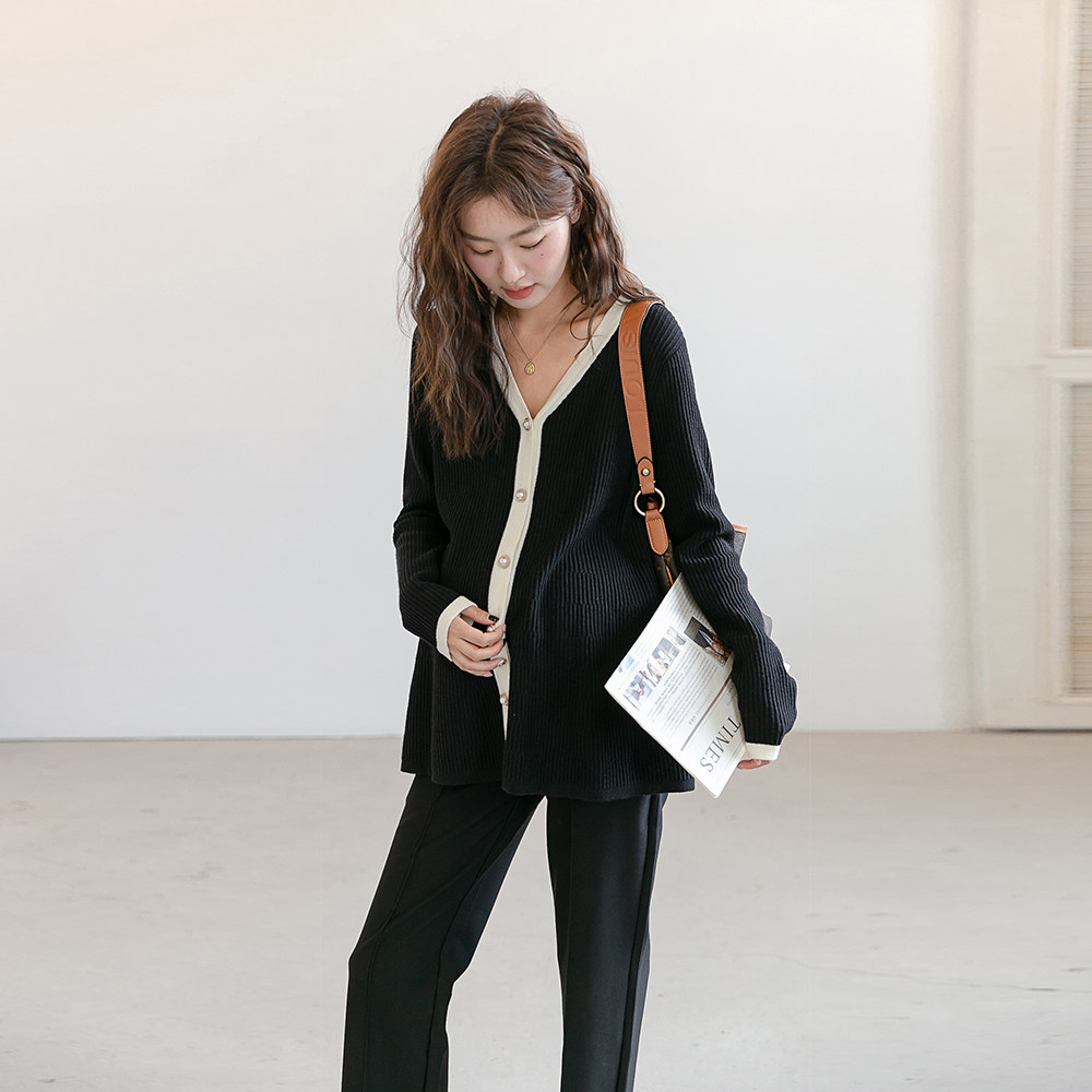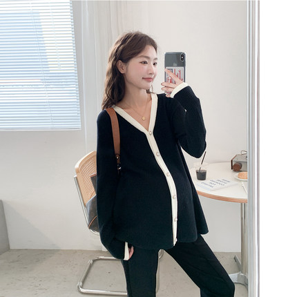 小香风~时尚洋气孕妇装春秋装撞色V领气质针织衫外套遮肚显瘦上衣