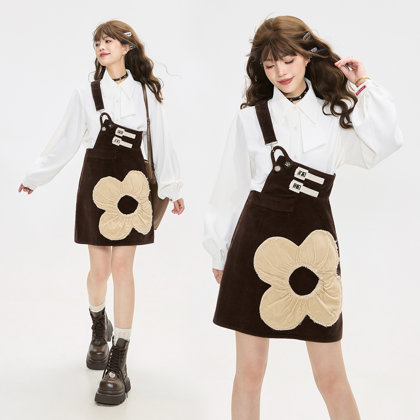 KEIKO 抽皱花饰斜肩条绒背带裙25秋季设计感收腰A字连衣裙短裙子