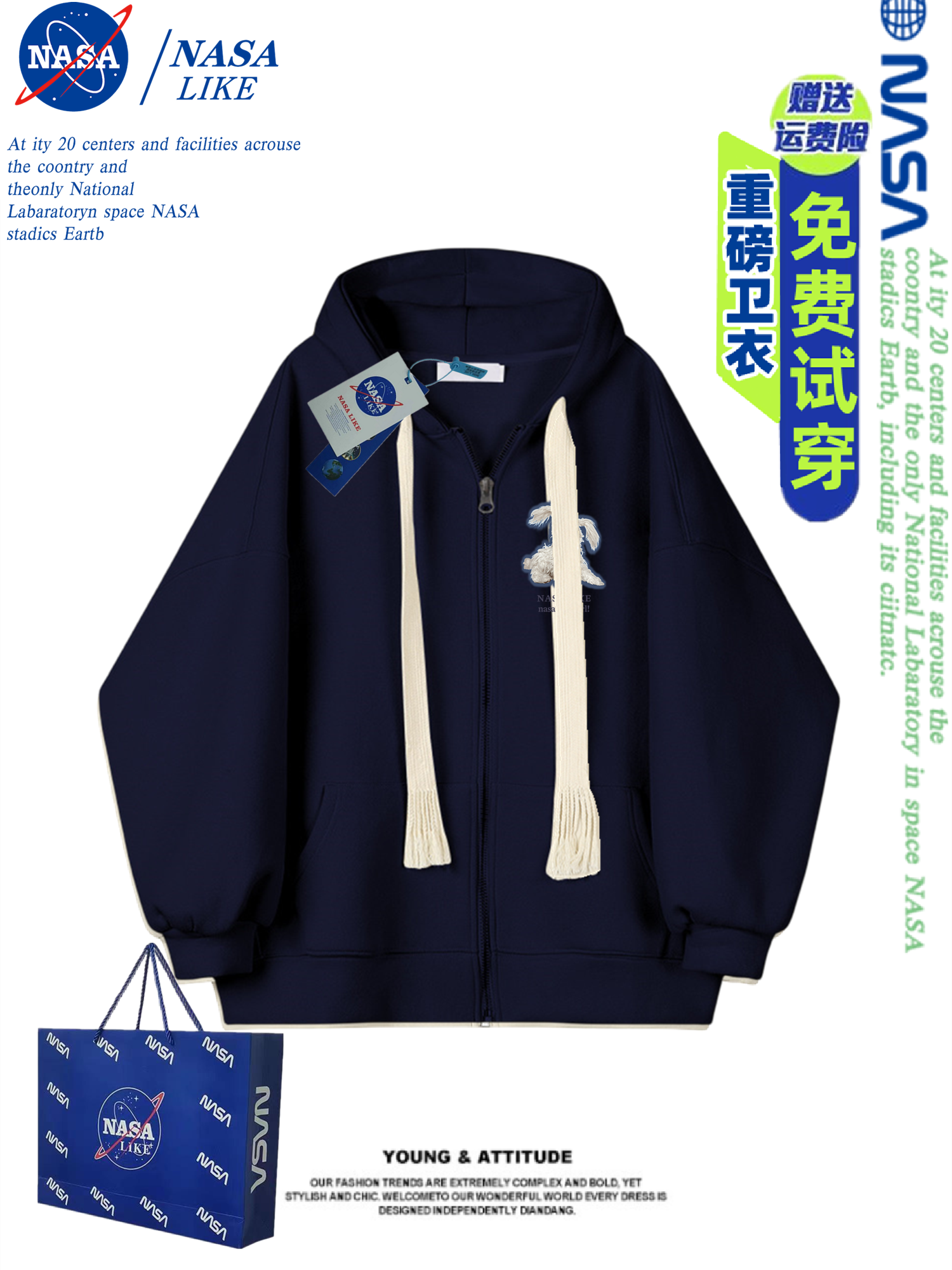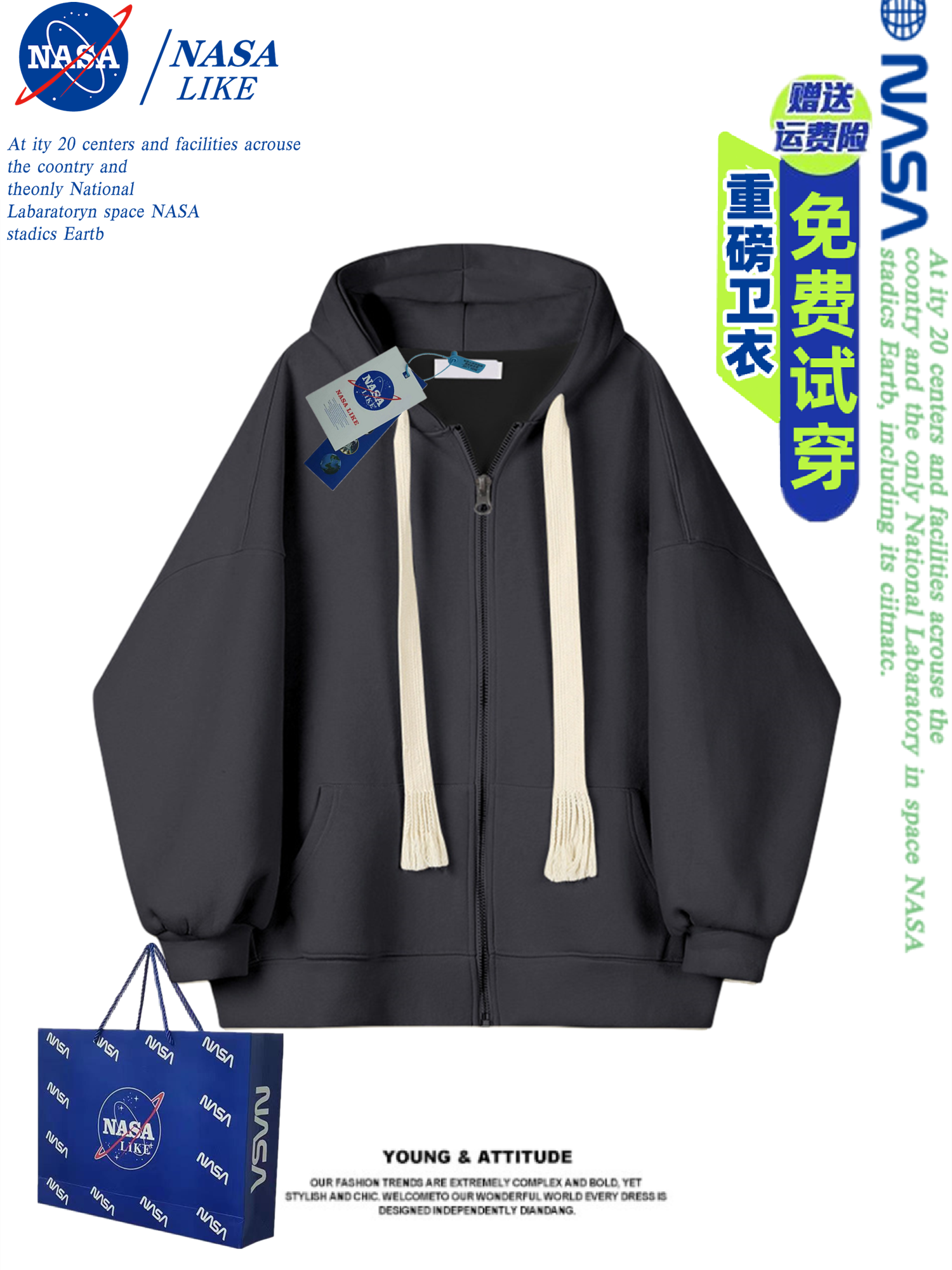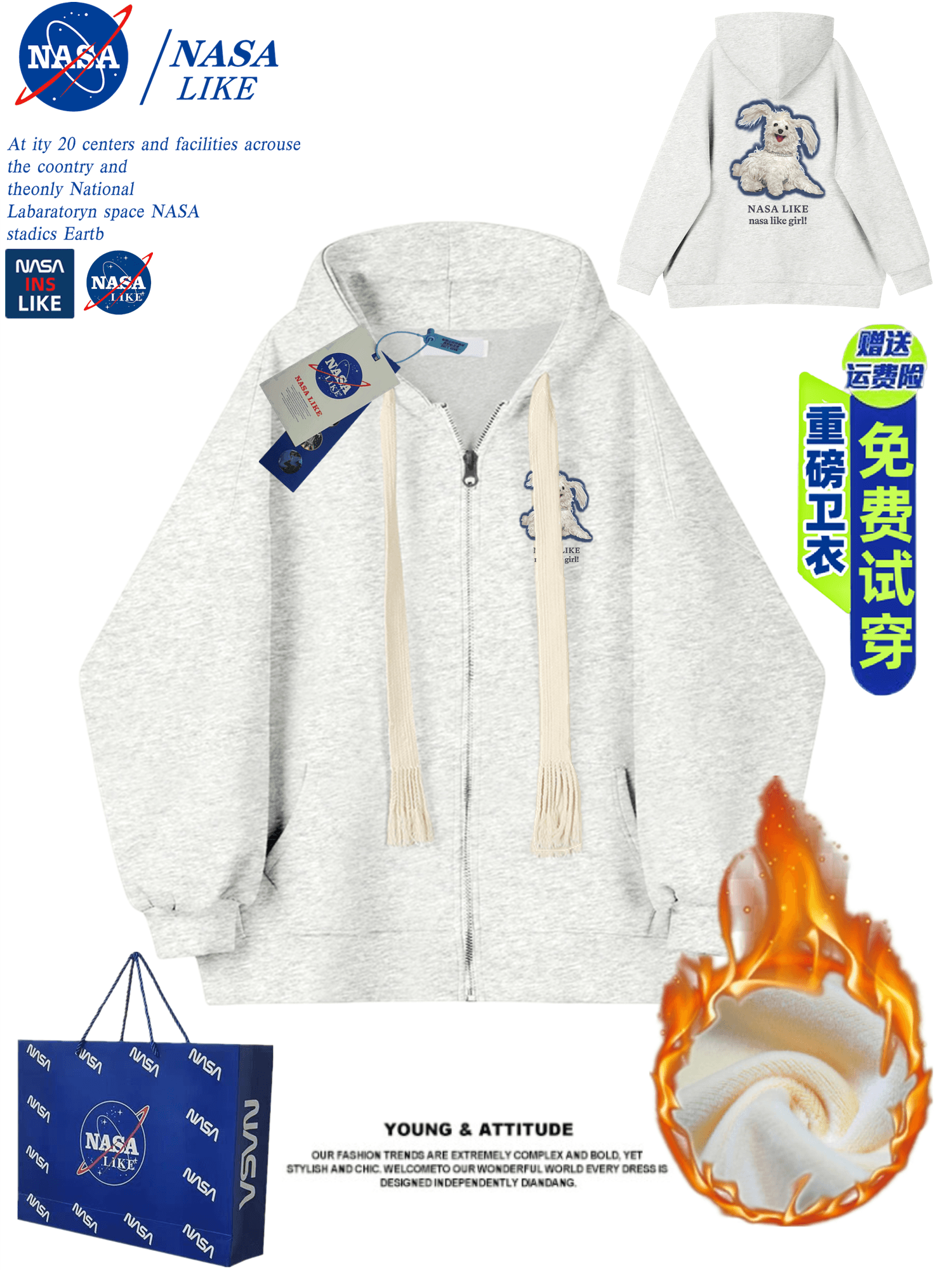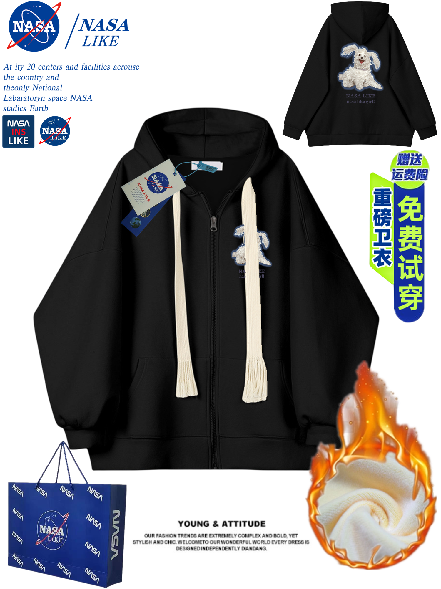 NASA秋冬季新款重磅加绒加厚美式开衫拉链休闲百搭卫衣男女款外套