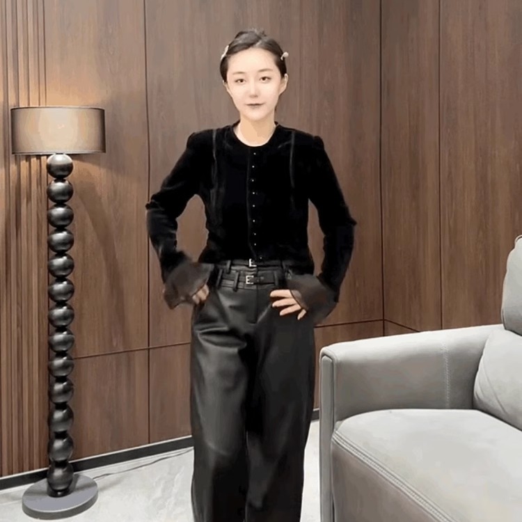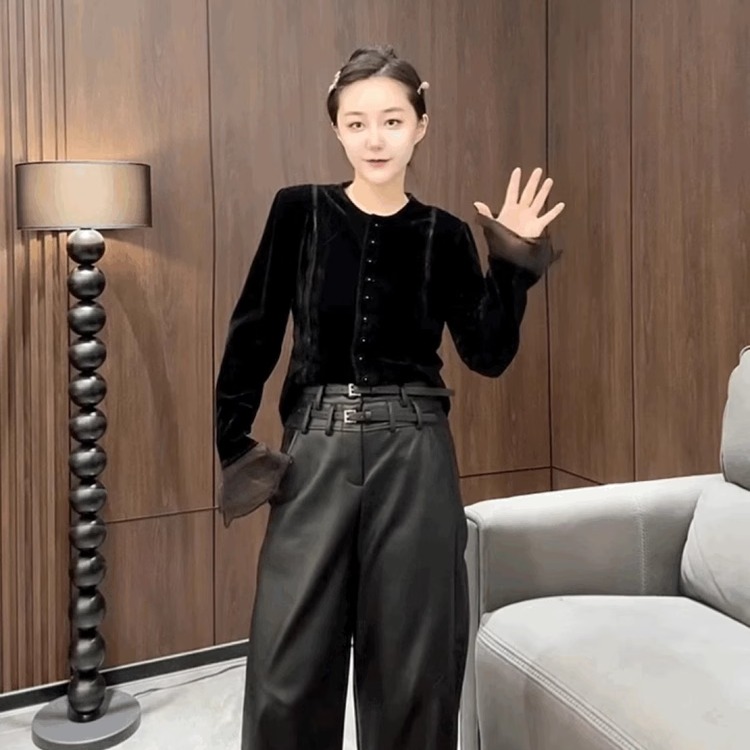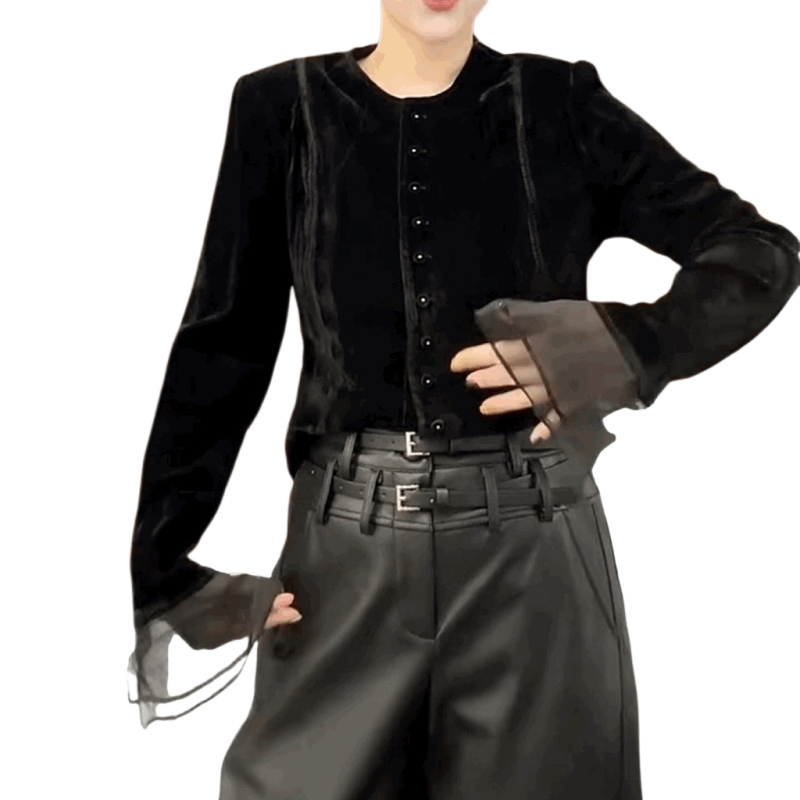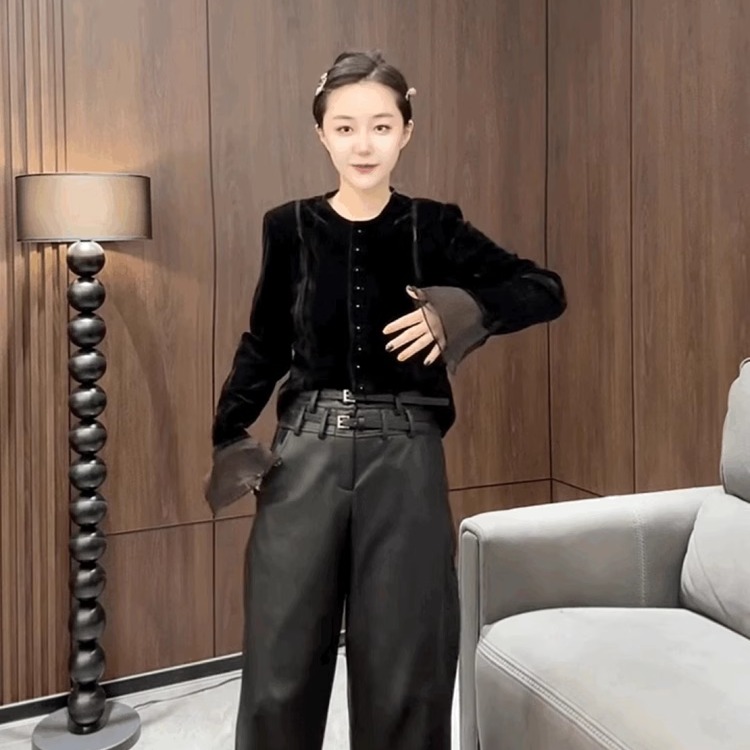 法式名媛小香风金丝绒衬衫女黑色丝绒圆领上衣喇叭袖T恤打底小衫