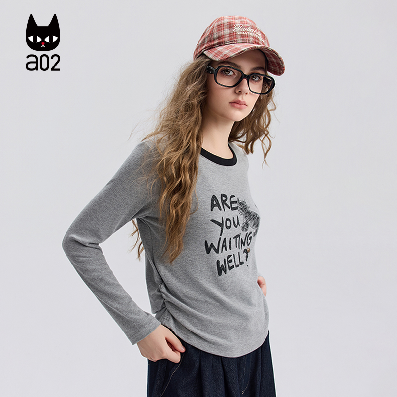 a02黑猫系列宽松短款白色圆领长袖T恤女2025新款秋季打底衫上衣