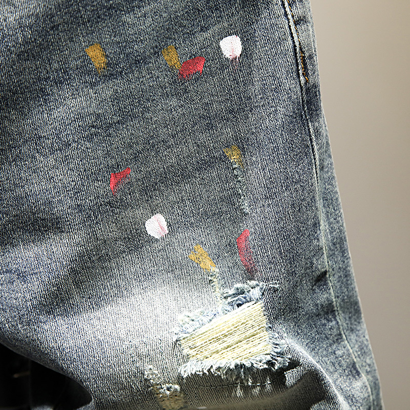 潮牌水洗复古做旧牛仔裤男士泼墨喷漆泼墨修身乞丐裤子小脚2025