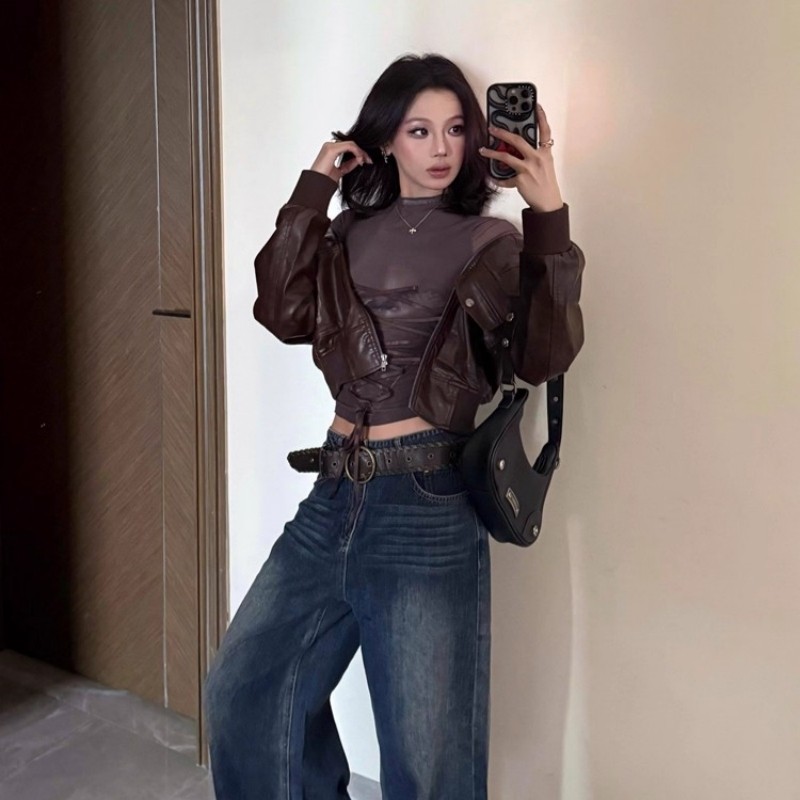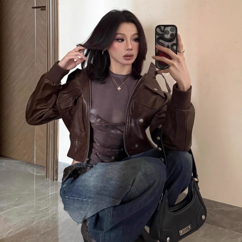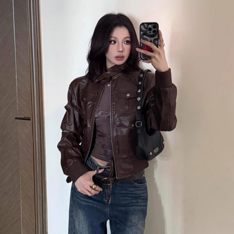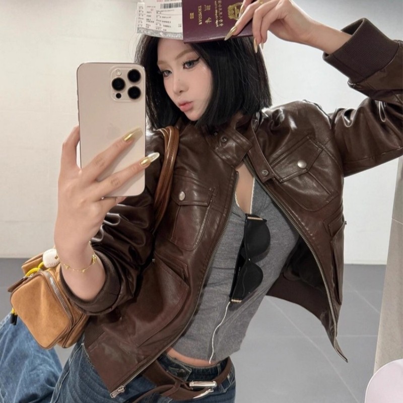 美式复古棕色皮衣外套女短款2025春秋新款高级休闲机车独特皮夹克