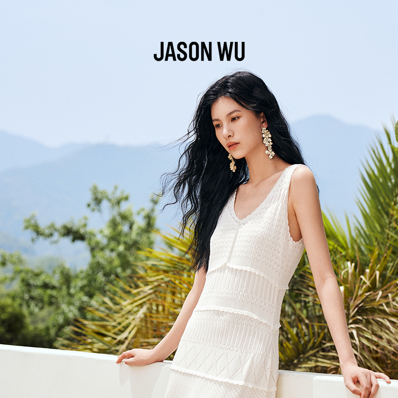 JASON WU25新款仿蕾丝镂空简约针织连衣裙白色度假背心长裙