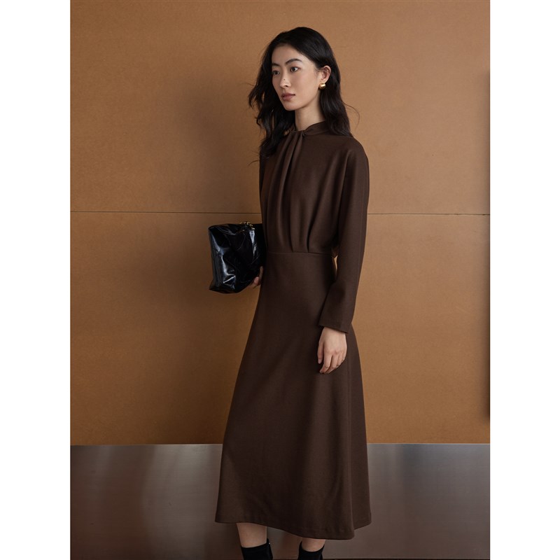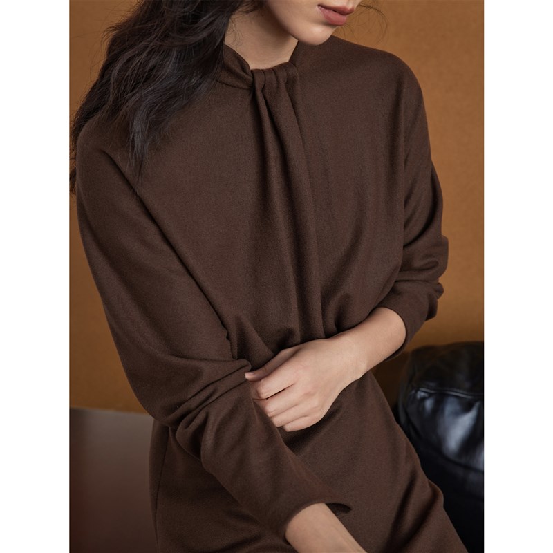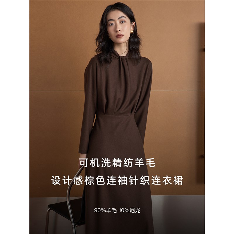 芝美日禾 可机洗精纺羊毛连袖设计感立体褶中长款棕色针织连衣裙