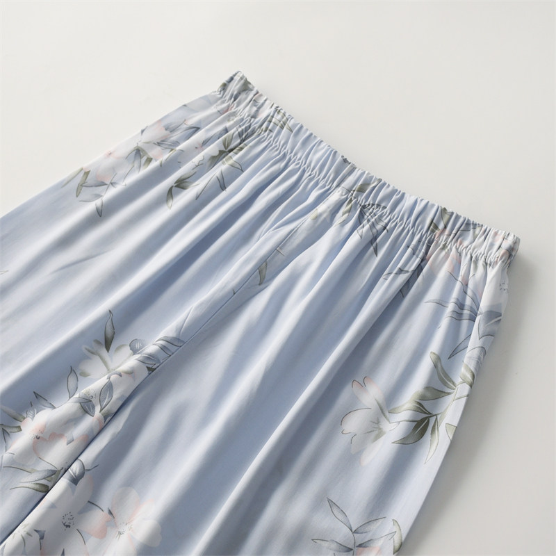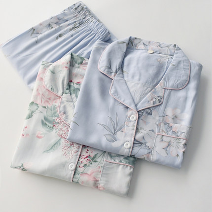 淡雅印花茉莉花睡衣女春夏季人造棉棉绸薄款凉感长袖家居服套装