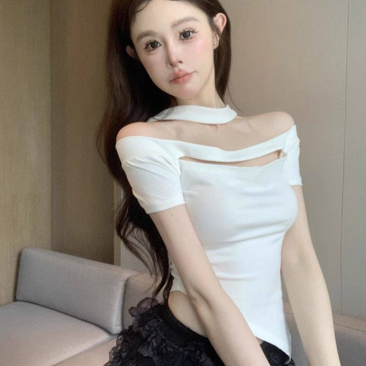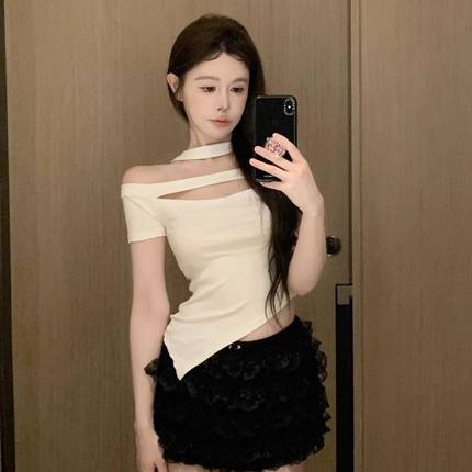 纯欲甜辣妹一字领露肩短袖镂空短袖T恤女紧身显瘦短款不规则上衣