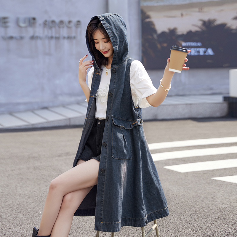 复古口袋连帽长款过膝牛仔马甲女夏中长无袖风衣坎肩背心马夹春秋