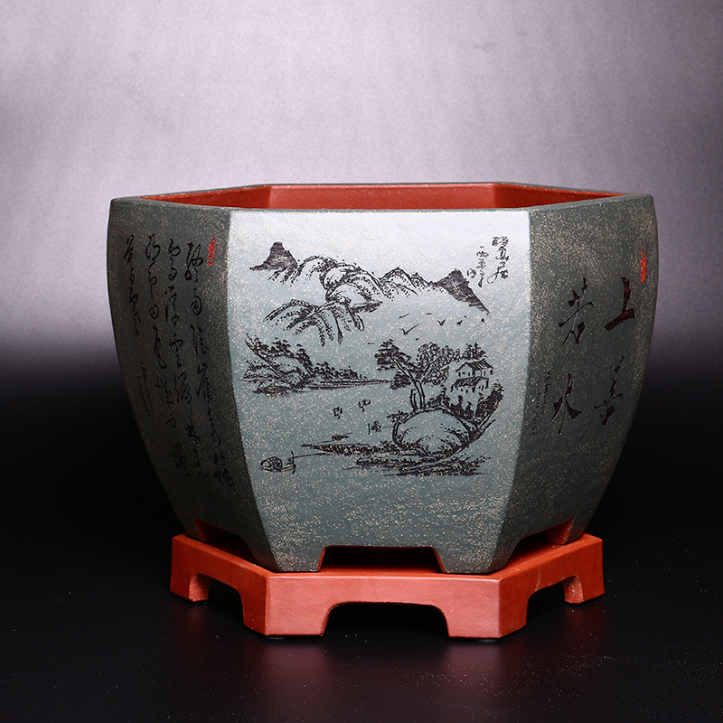 宜兴紫砂花盆陶瓷高档大口径六方客厅发财树花盆精品盆景盆带底座