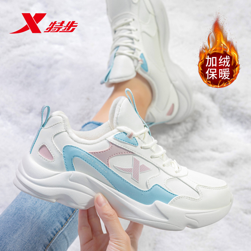 特步女鞋冬季棉鞋皮面防水加绒保暖加厚休闲鞋子女款二棉运动鞋女