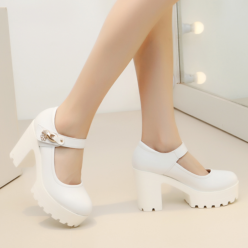 厚底舒适模特鞋松糕粗跟防水台搭扣高跟鞋女真皮演出走秀皮鞋白色