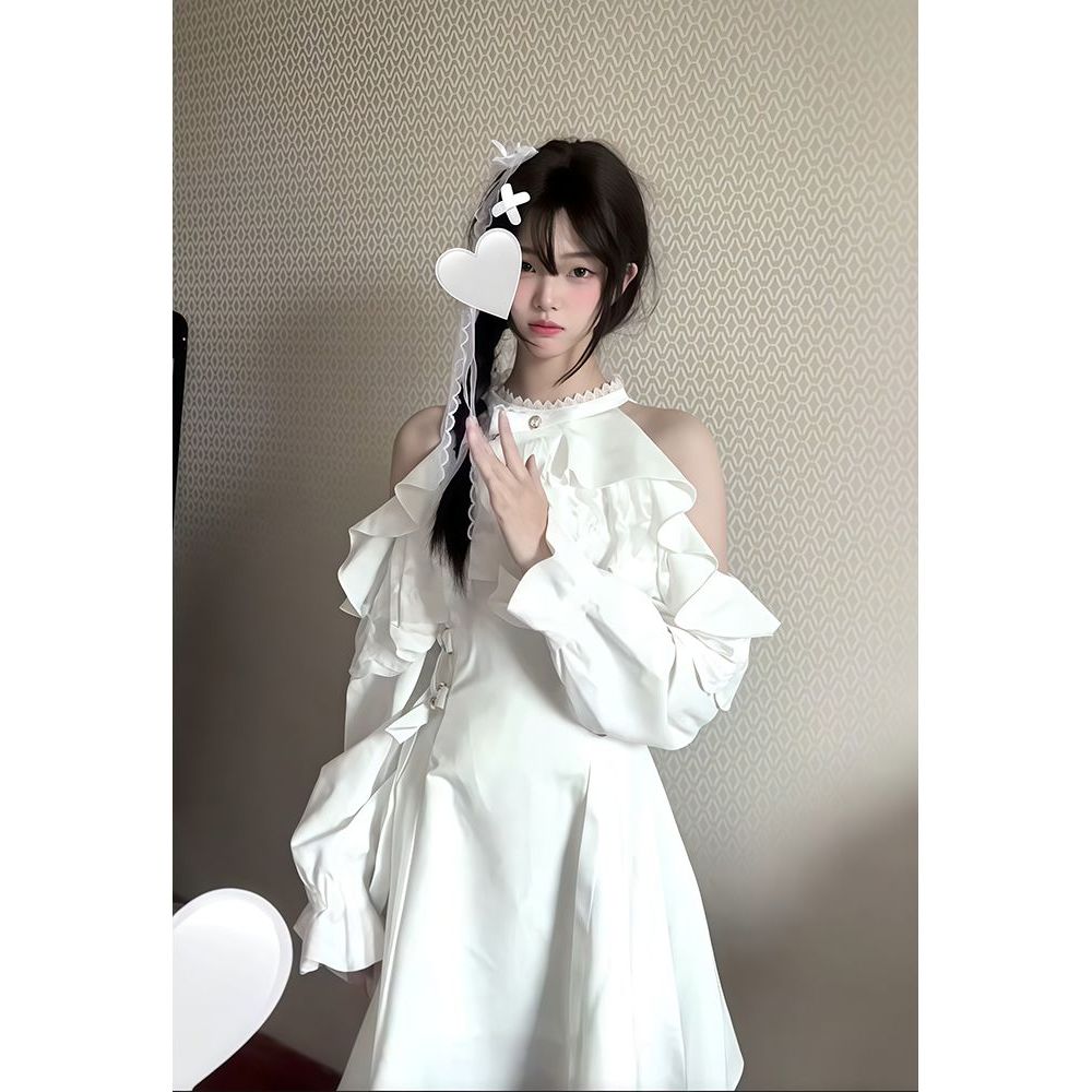 千金感连衣裙女春季2025新款Lolita白色挂脖露肩荷叶边遮肉短裙子