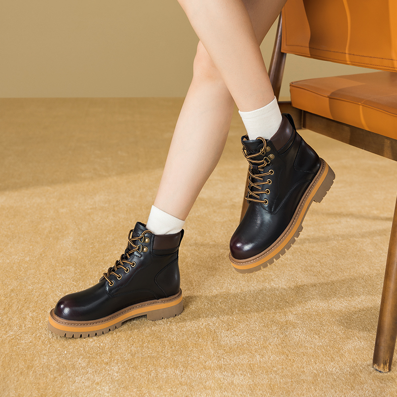 奥康女鞋 冬季新款保暖厚底复古马丁靴潮流纯色机车靴时装靴