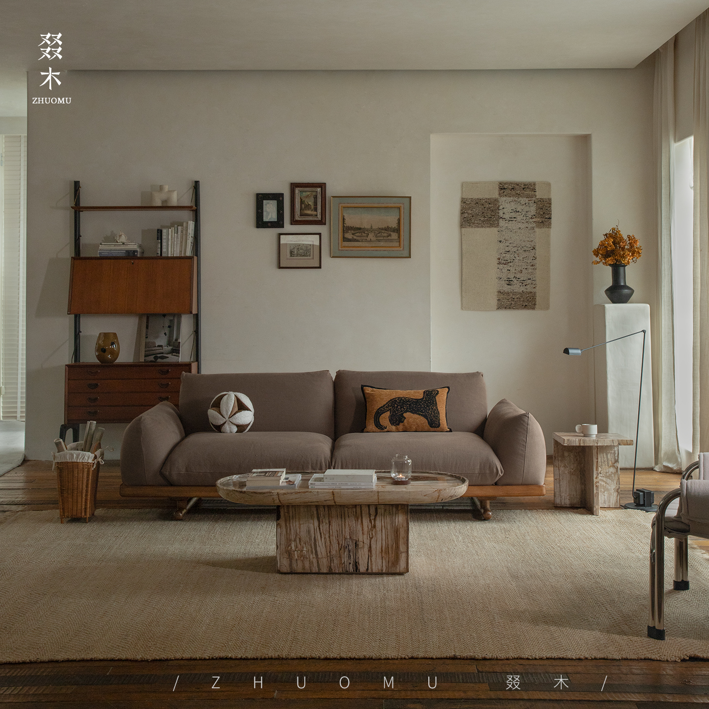 叕木|面包沙发北欧ins复古侘寂风印尼柚木亚麻三人位实木布艺沙发
