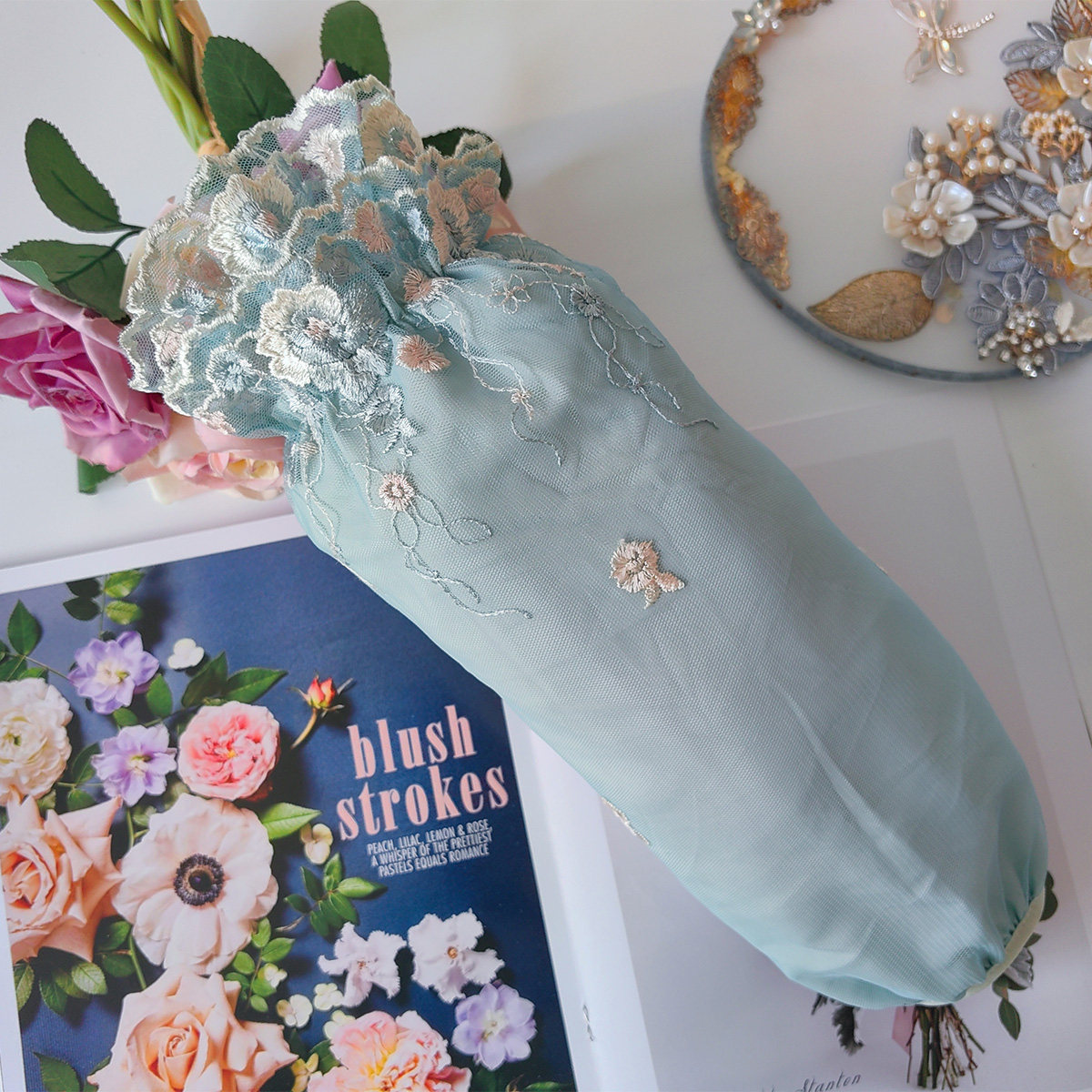 买2送1秋冬韩版蕾丝长款袖套 成人女士长款蓝色防污袖套防脏套袖
