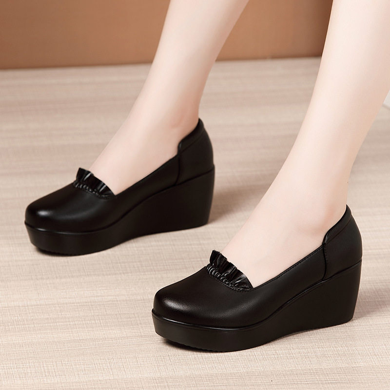 圆头软底中老年套脚单鞋女防水台厚底中跟妈妈单鞋大码坡跟女鞋