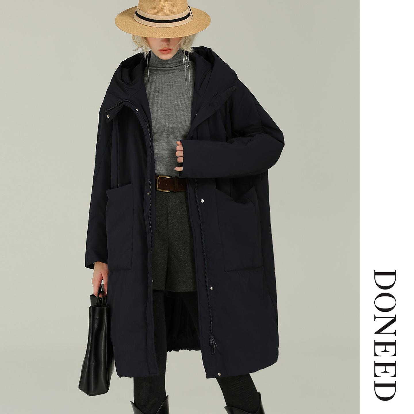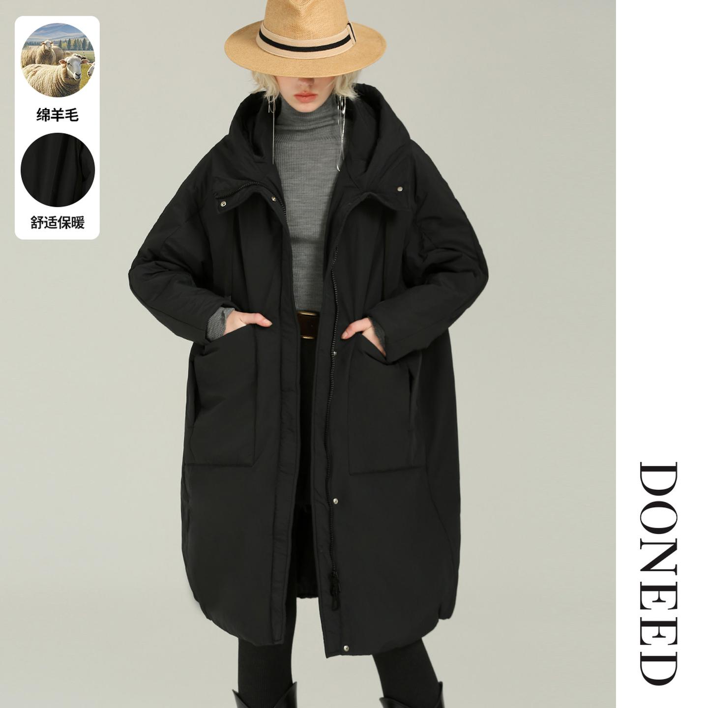 DONEED2025冬季设计感绵羊毛内胆外套长款休闲慵懒风连帽棉服女