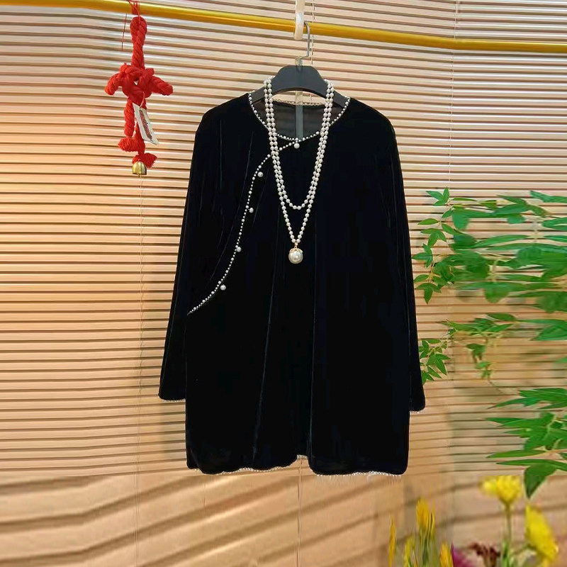 胖妹妹钉珠领长袖丝绒上衣大码女装法式复古风秋季款黑色百搭小衫