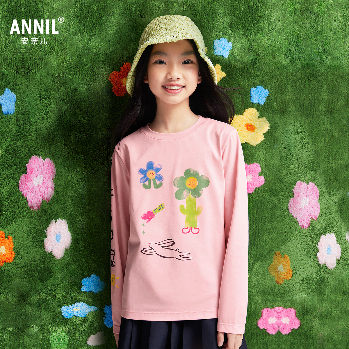 安奈儿童装女童打底衫长袖T恤2025春新款弹力休闲印花可爱时尚