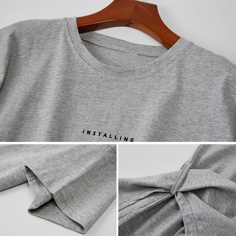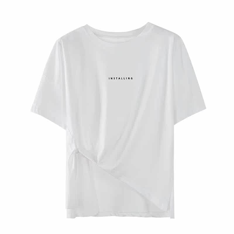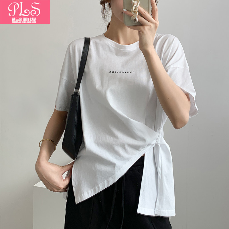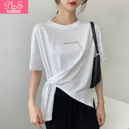 夏季新款纯白宽松大码女装圆领短袖T恤中长款纯色简约字母上衣