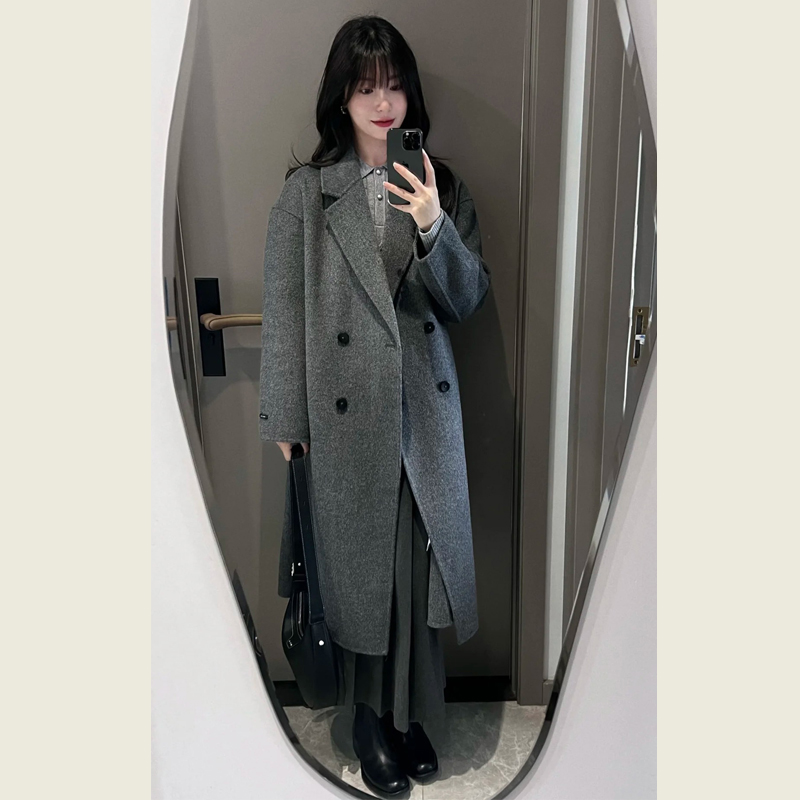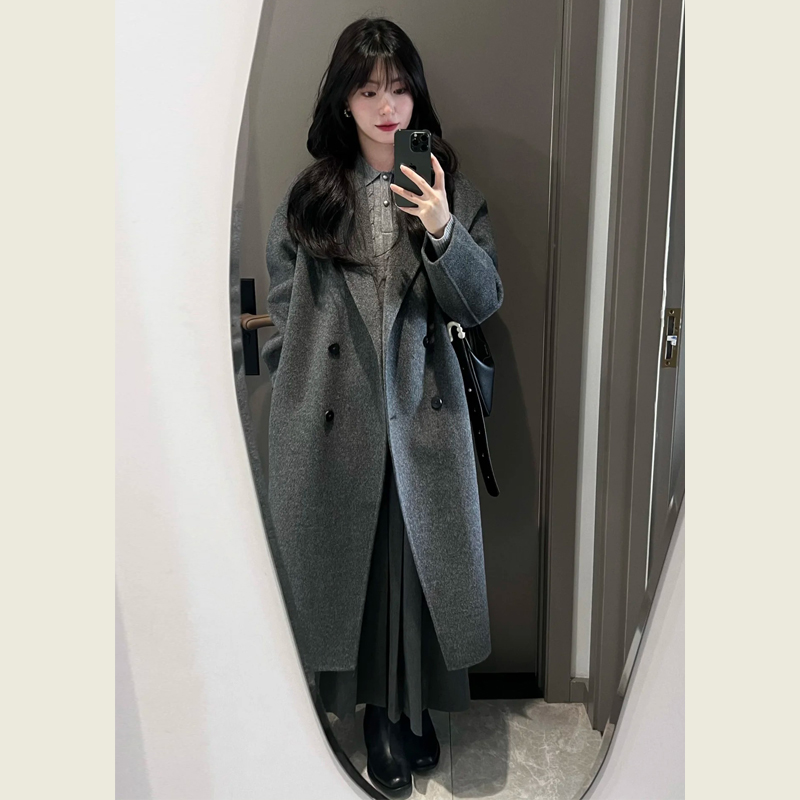 韩系赫本风深灰色呢子大衣女中长款小个子秋冬季高级感毛呢外套