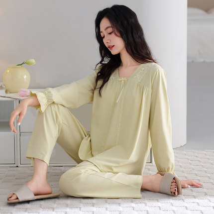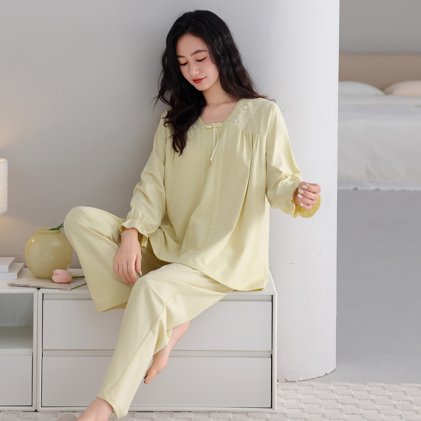 莱卡棉睡衣女长袖纯棉春秋季套头蕾丝中年带胸垫舒适可外穿家居服