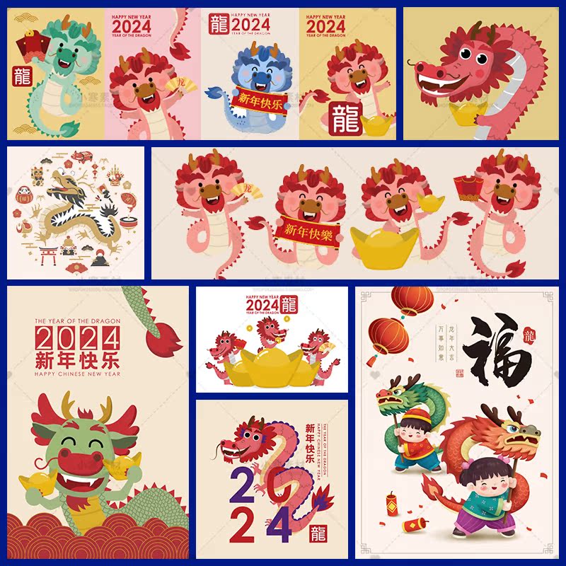 2024新龙年元旦卡通潮流手绘插画展板海报背景图案AI矢量设计素材