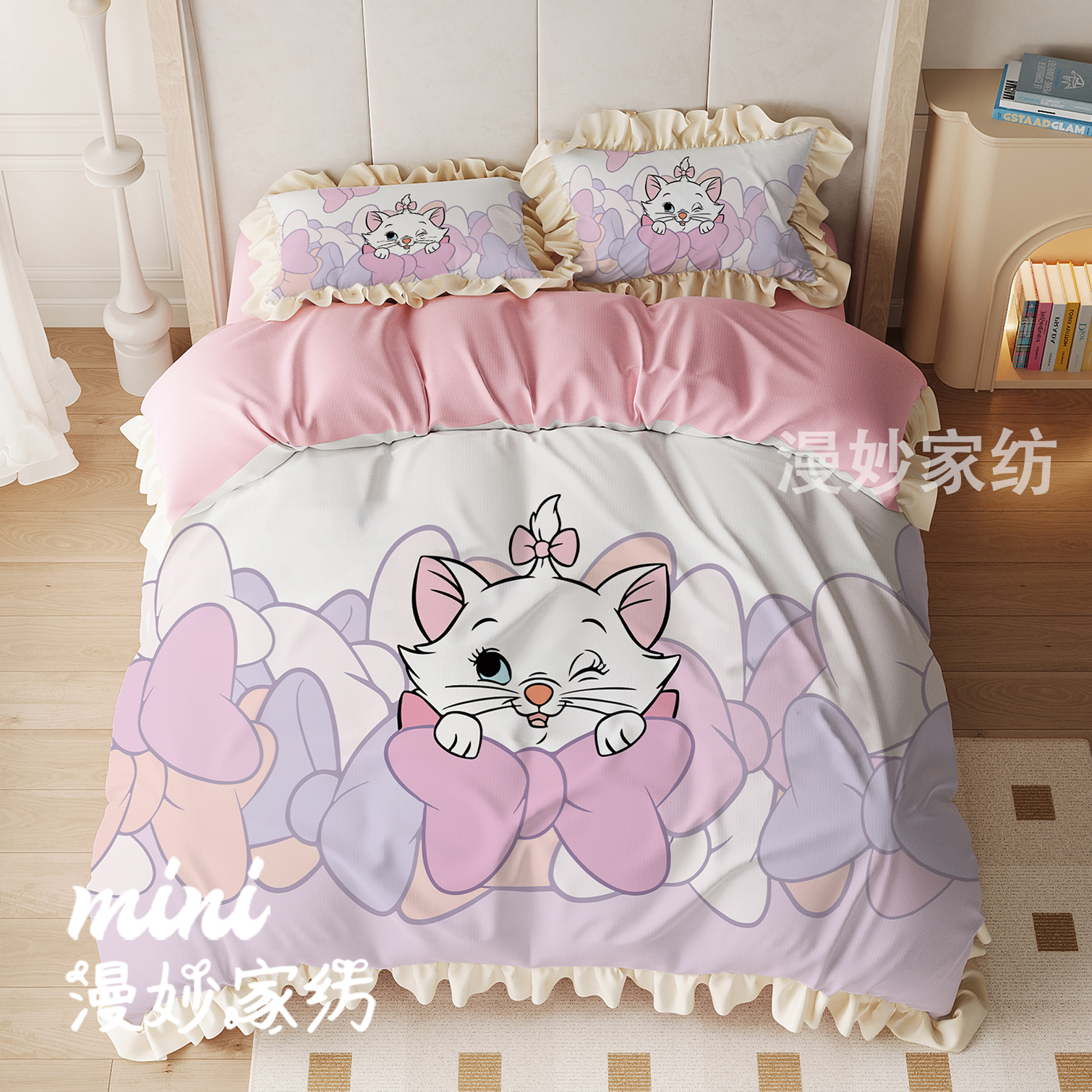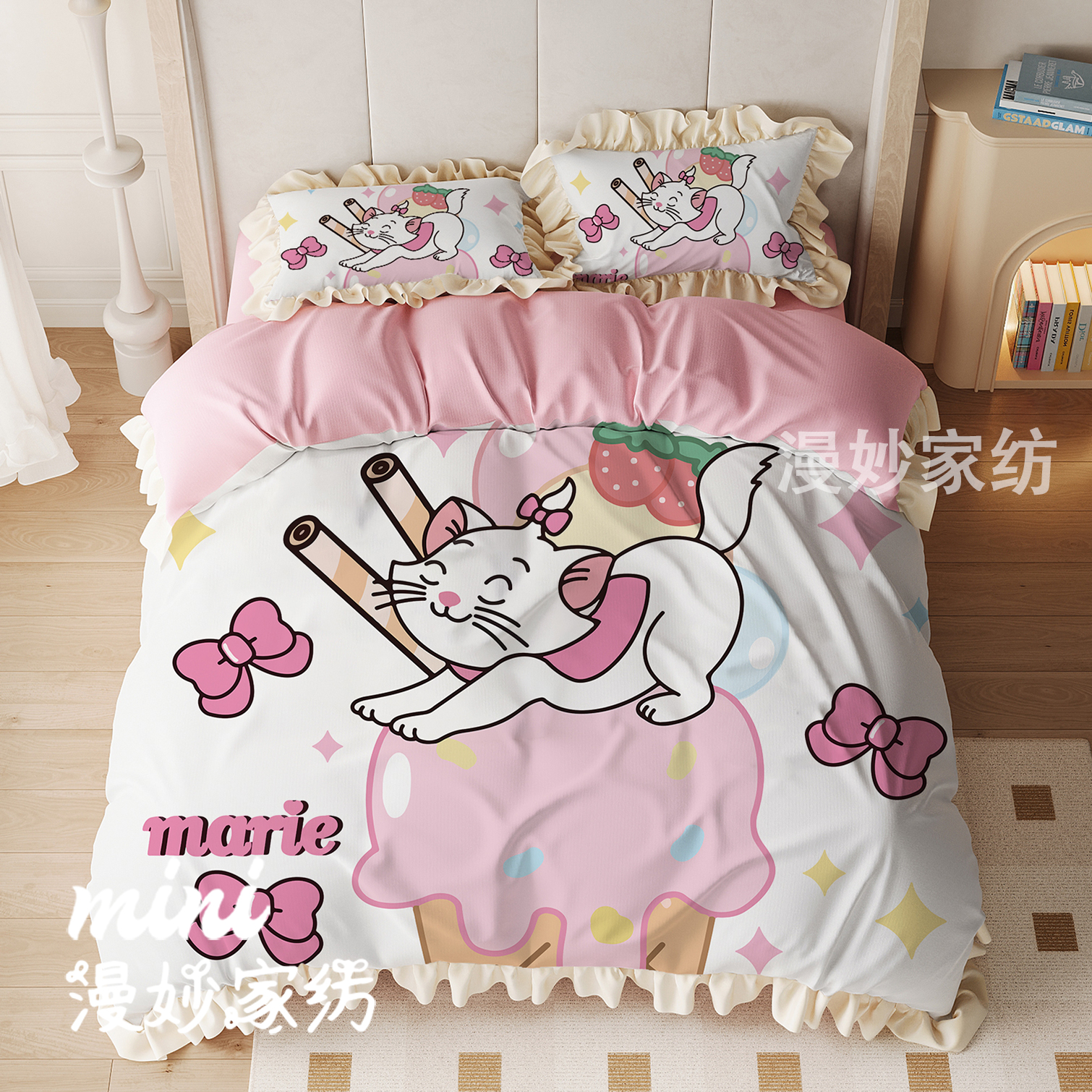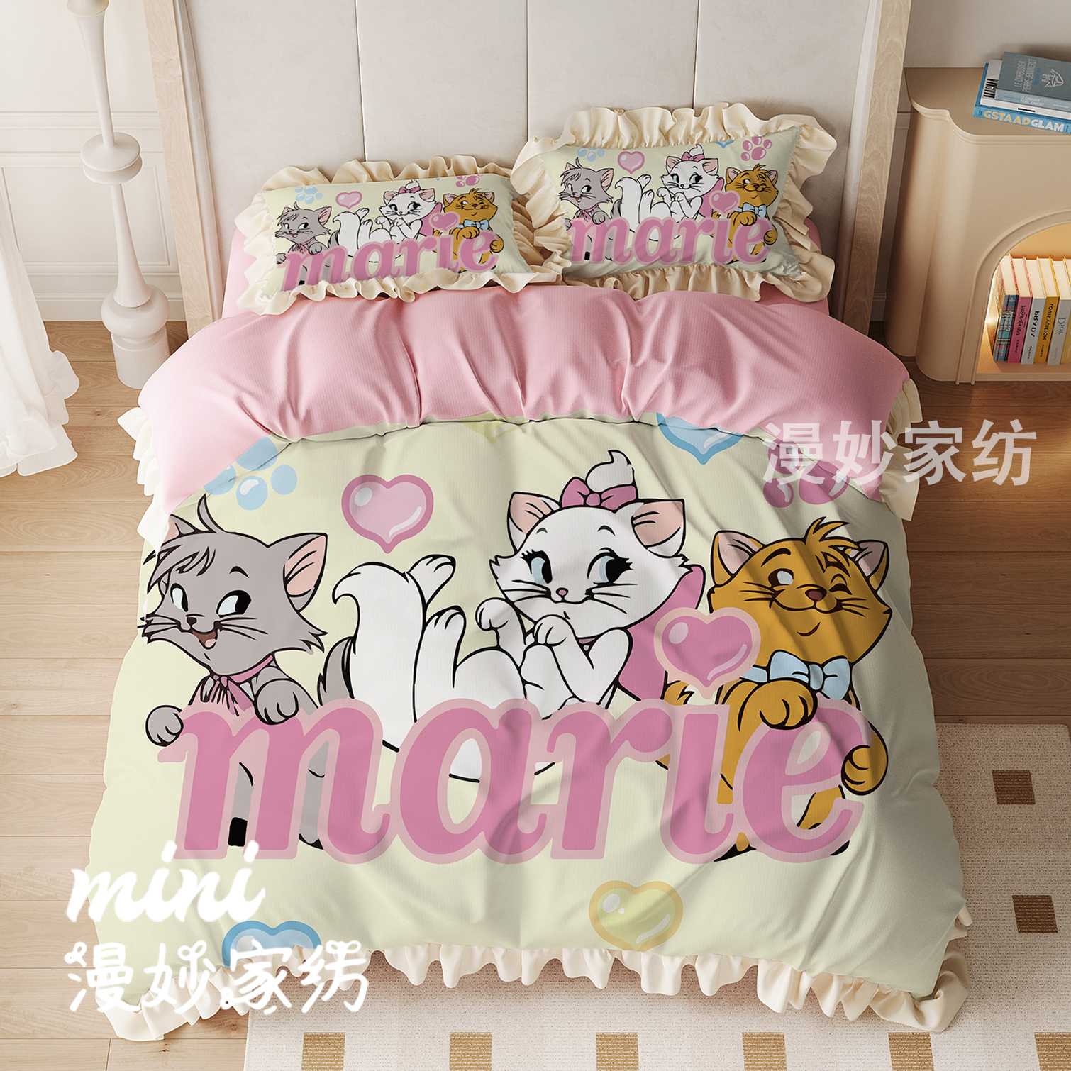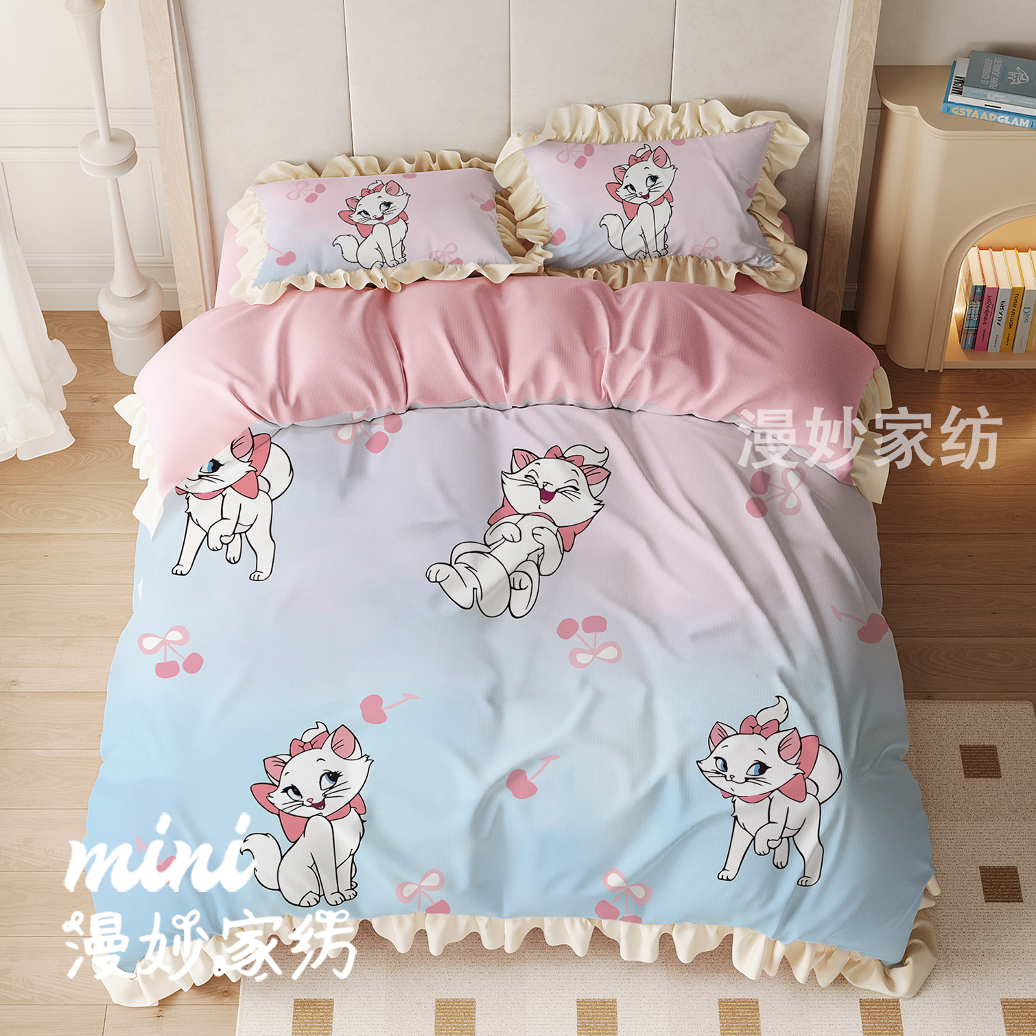 卡通公主风花边四件套玛丽猫被套床单儿童房床品宿舍单人三件套