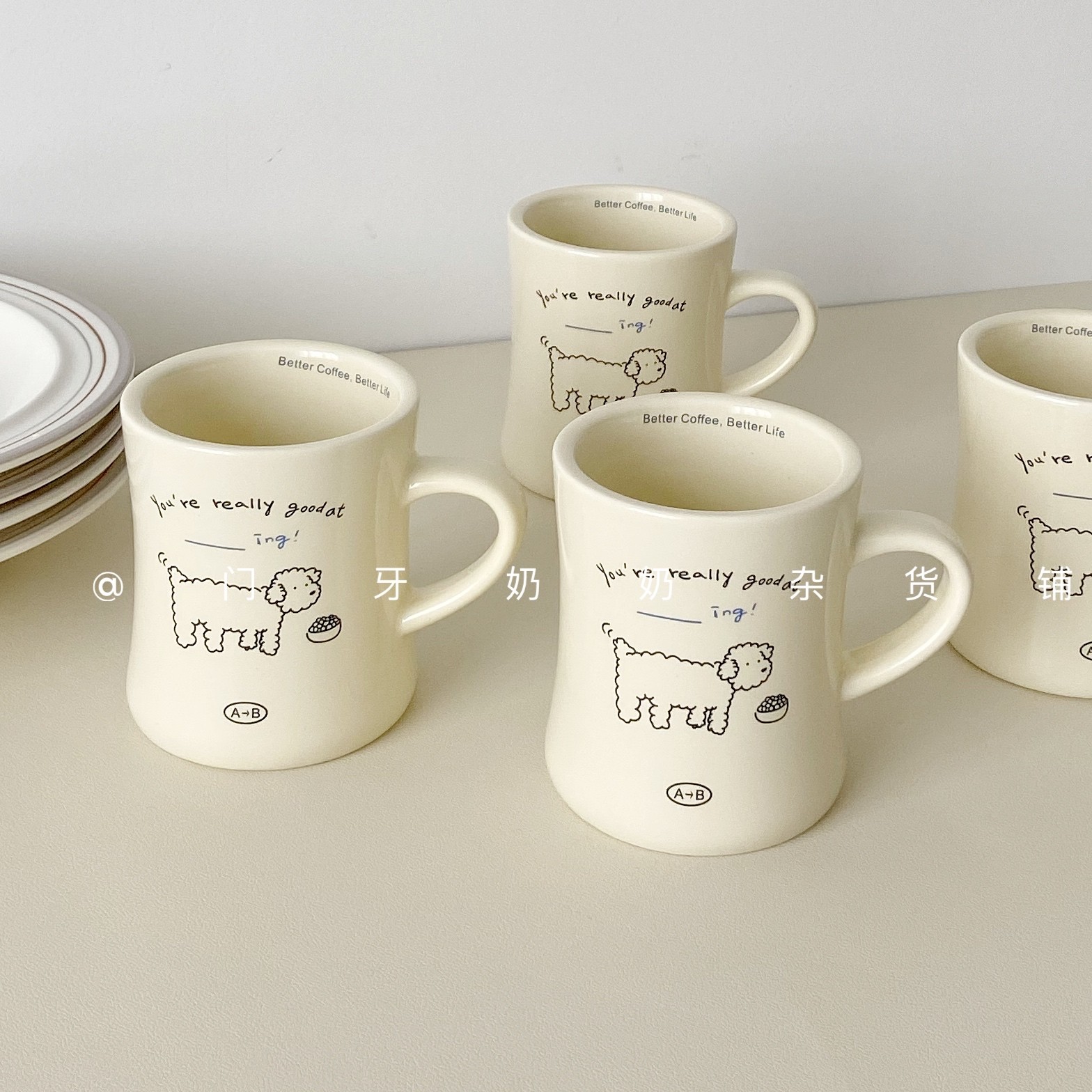 ins风奶油小狗插画陶瓷大马克杯卡通早餐杯牛奶杯咖啡店水杯耐热