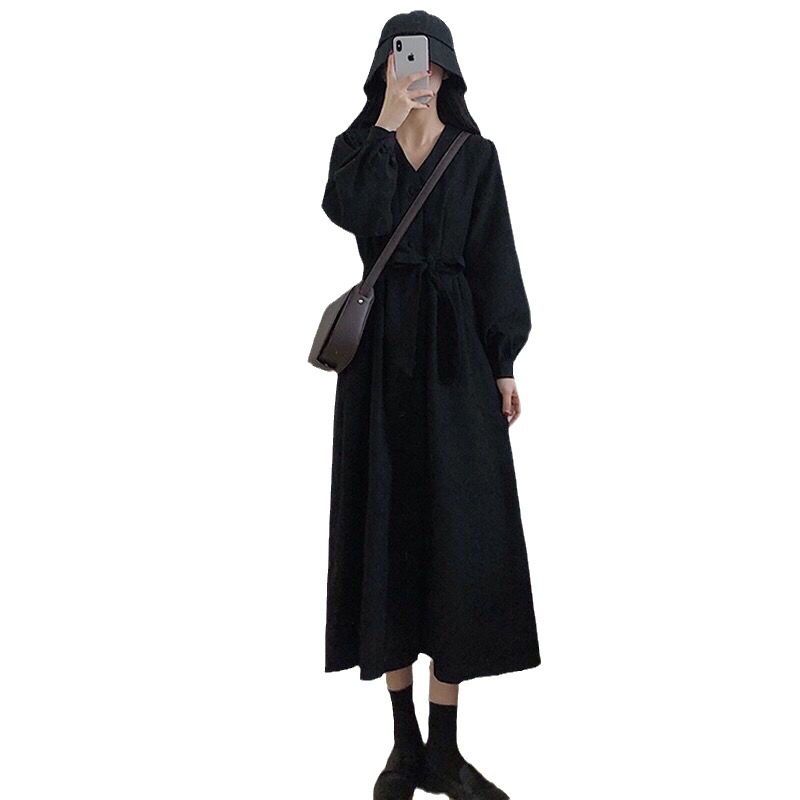 秋冬季赫本风气质长款厚连衣裙女复古宽松长袖大码胖mm衬衫长裙