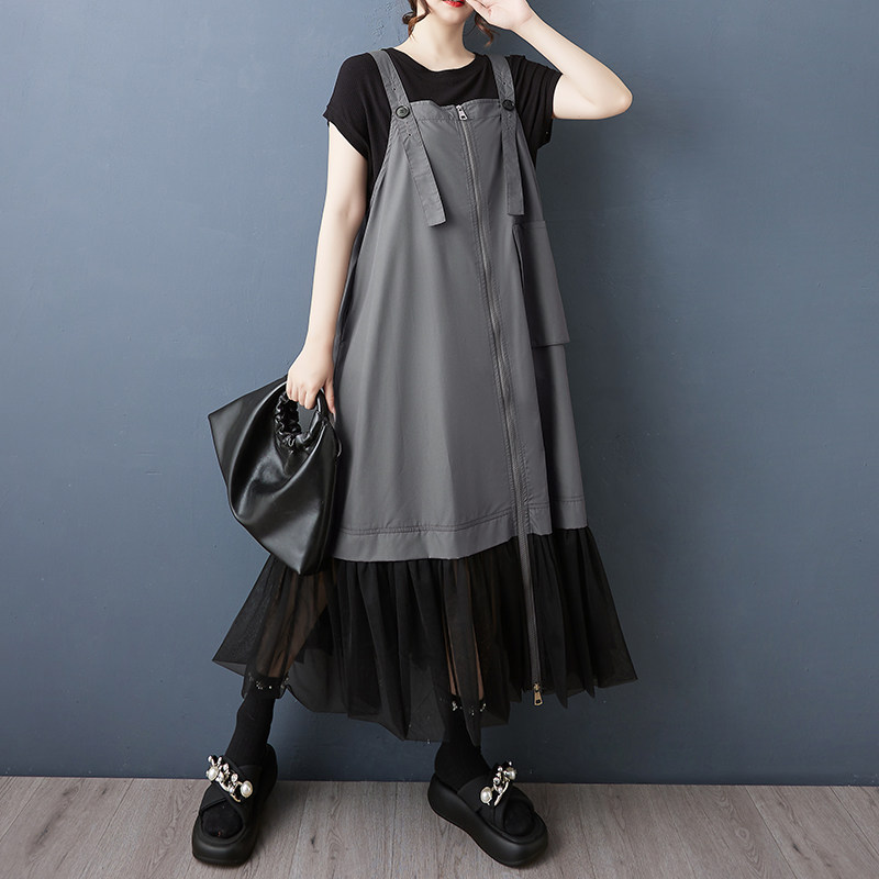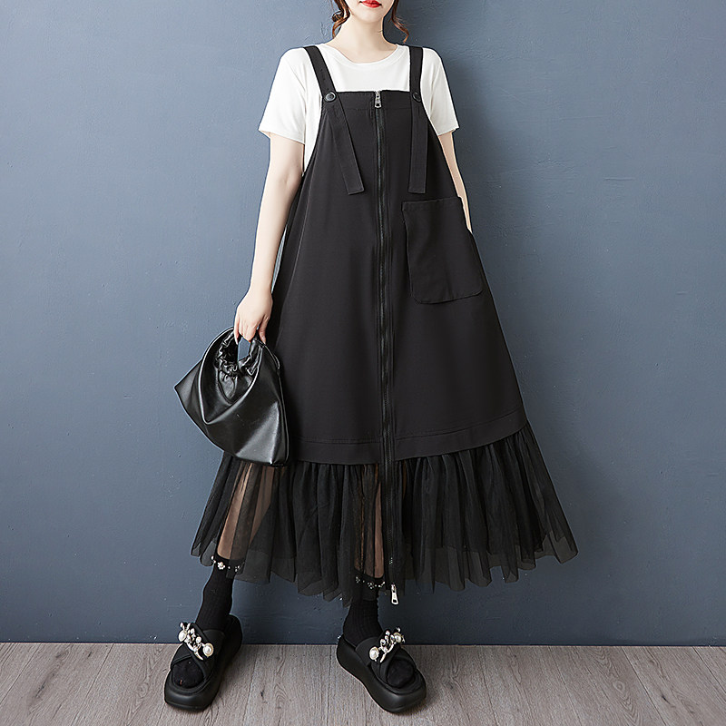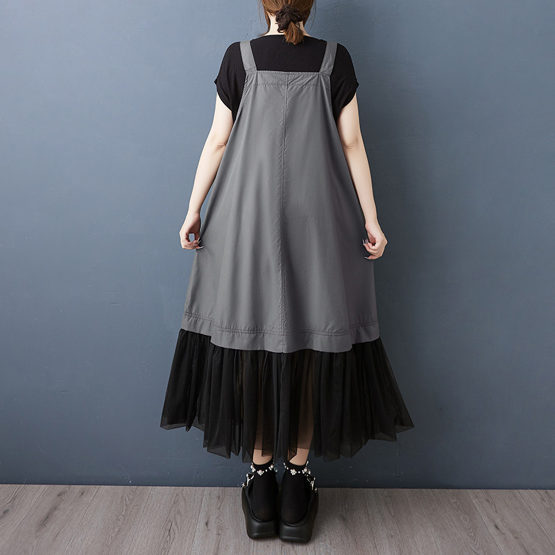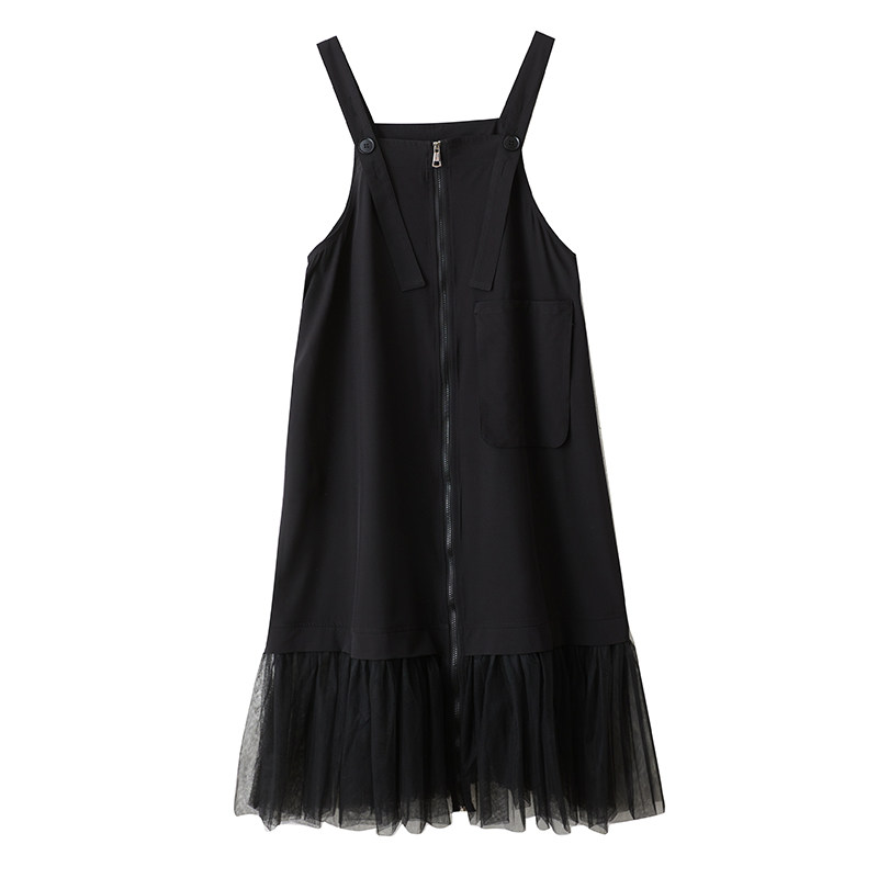 外贸夏装新款日系网纱拼接背带连衣裙时尚百搭宽松休闲气质背带裙