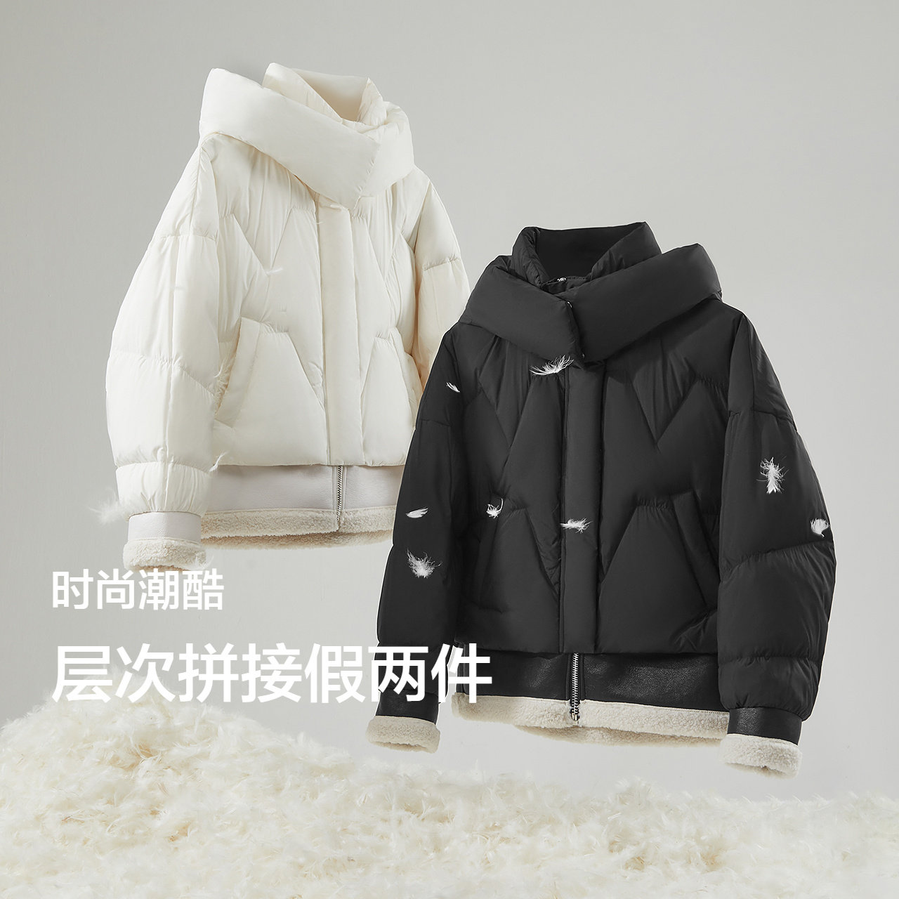 森马羽绒服女设计感拼接假两件宽松时尚2024冬季新款连帽外套潮酷