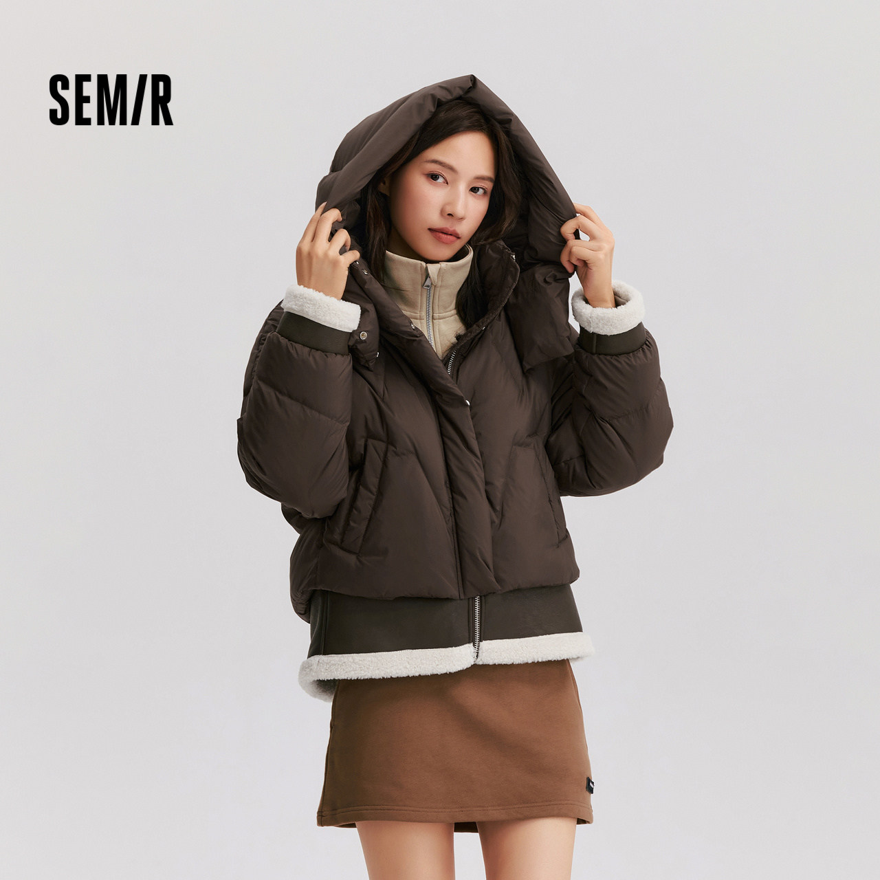 森马拼接假两件宽松连帽羽绒服女