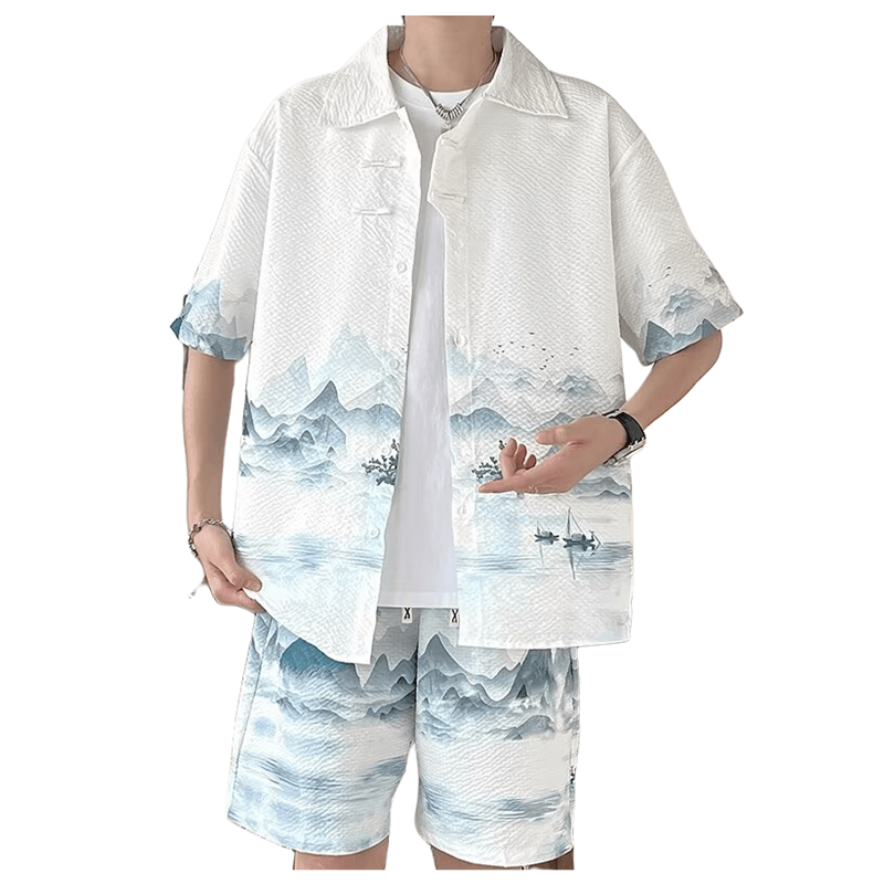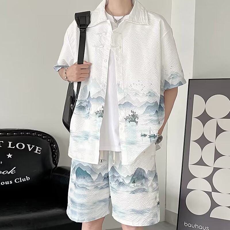 新中式冰丝衬衫男款夏季新款潮流中国风宽松休闲薄款短袖短裤套装