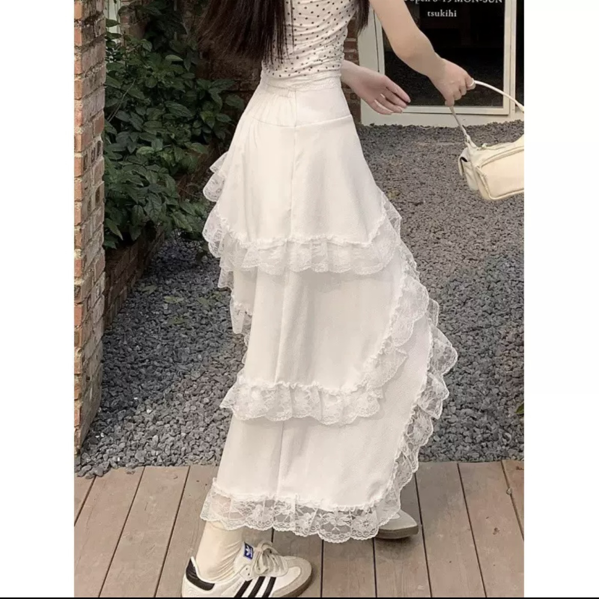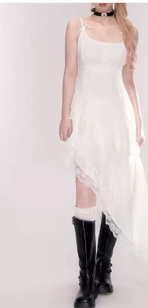RECOINR1C 白色蕾丝吊带连衣裙女夏仙气设计感不规则斜摆收腰长裙