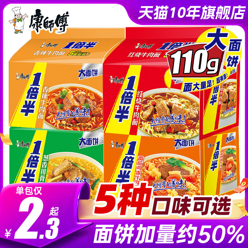 康师傅方便面红烧牛肉面5包一倍半香辣番茄鸡蛋袋装泡面1整箱批发
