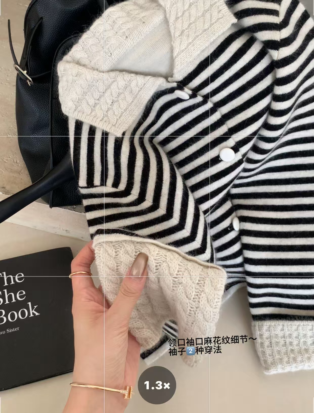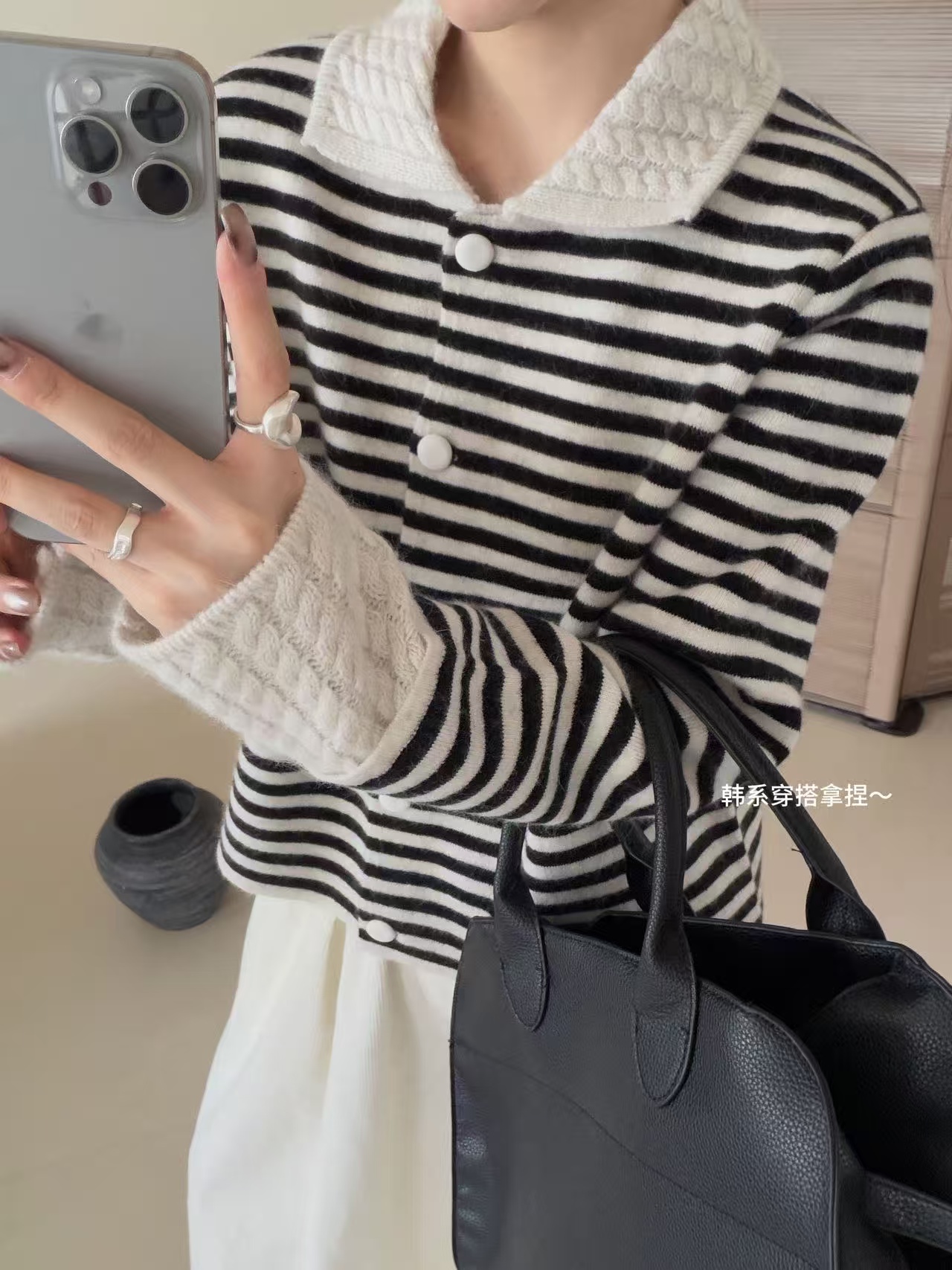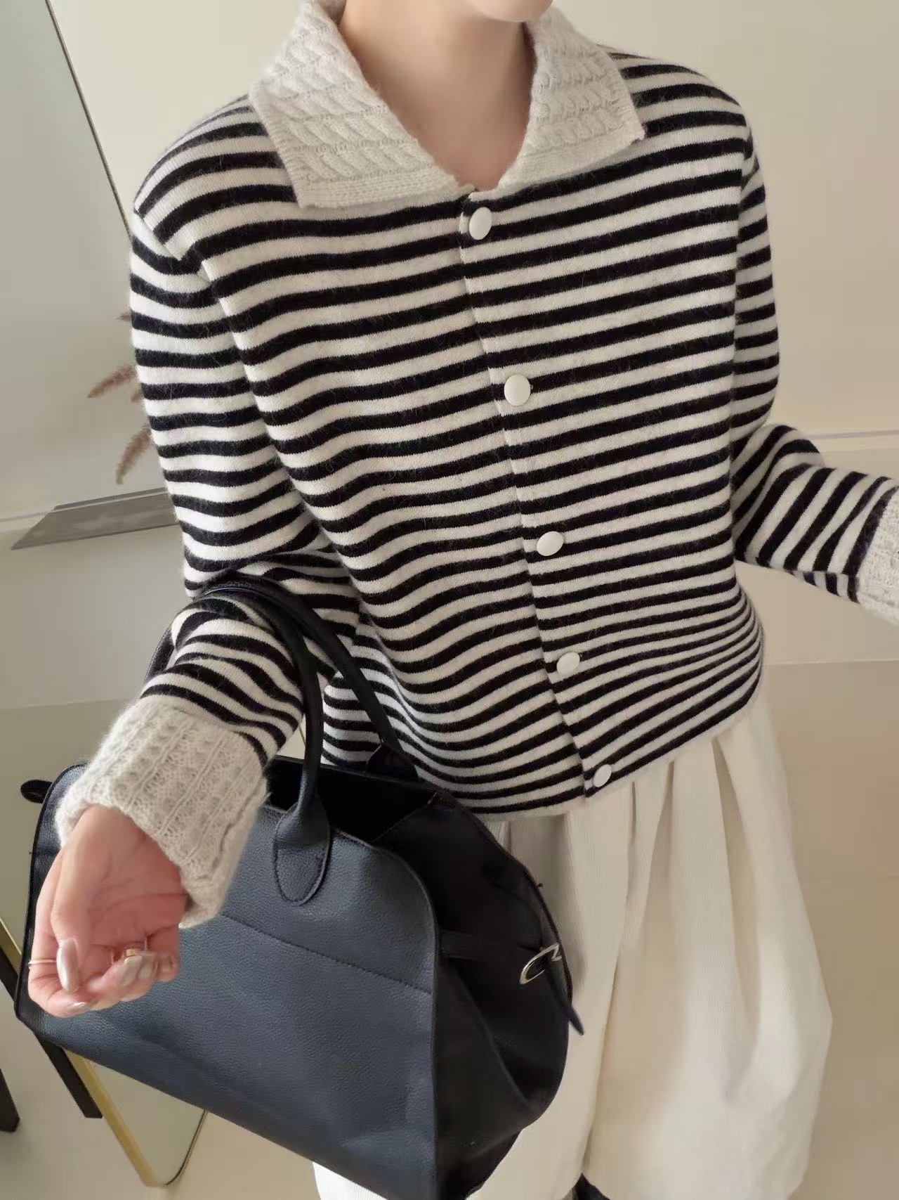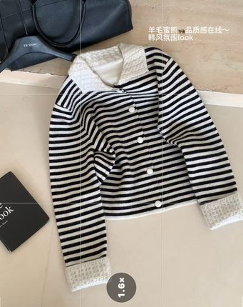 韩系圆领条纹拼色领长袖针织开衫女软糯洋气百搭温柔风毛衣外套