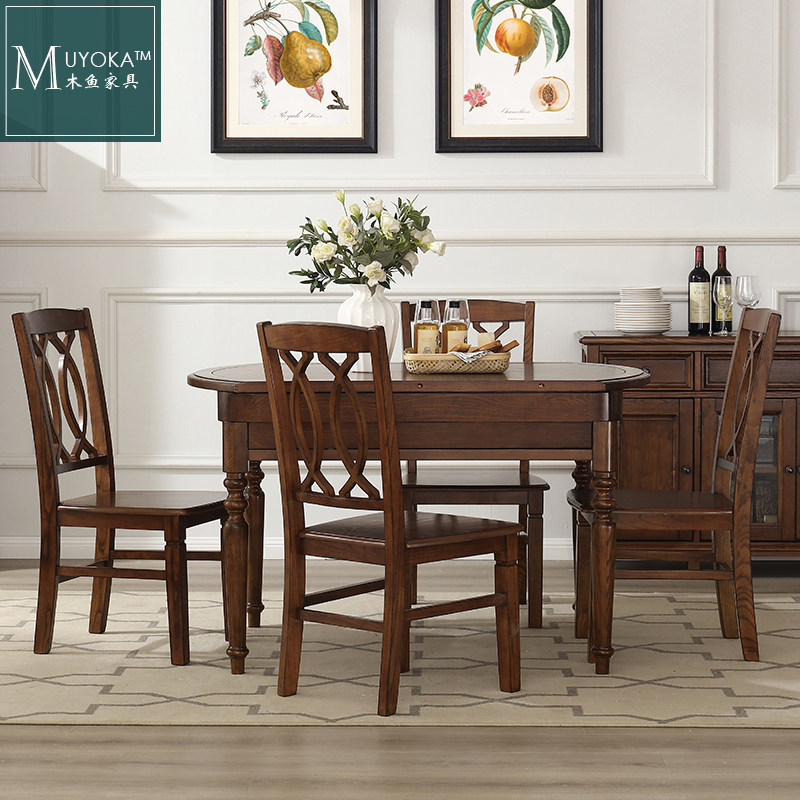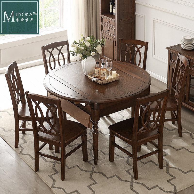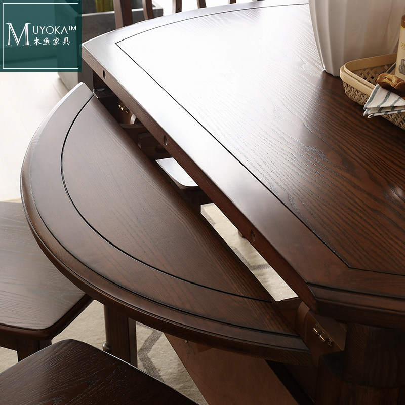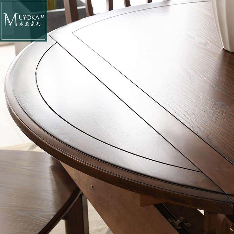 木鱼家具纯原木白蜡木全实木美式乡村复古跳台可伸缩圆餐桌餐厅