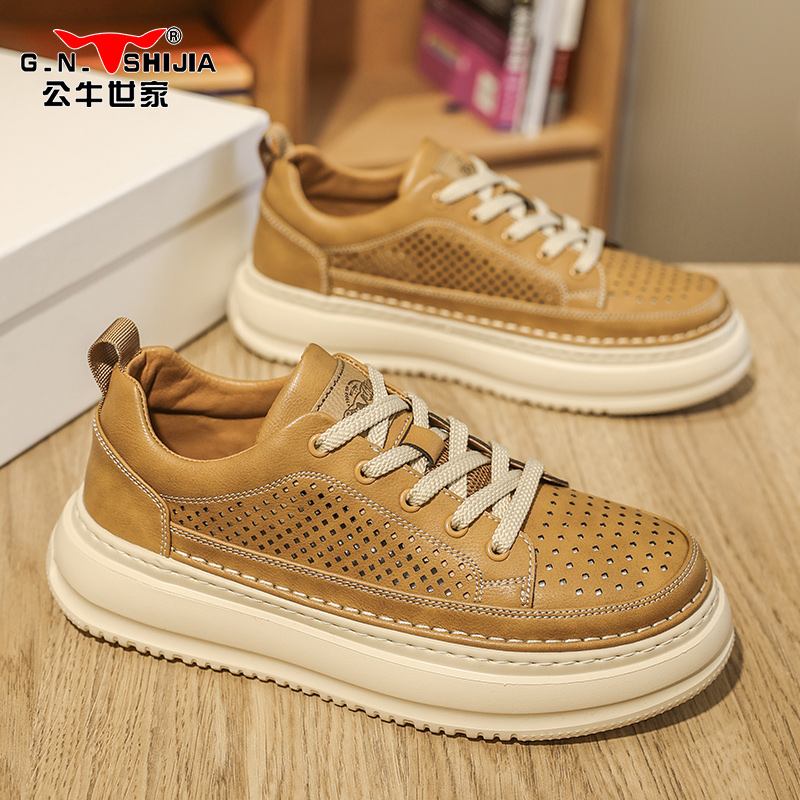 公牛世家板鞋男款2025新款夏季透气网孔休闲男鞋厚底增高小白鞋男