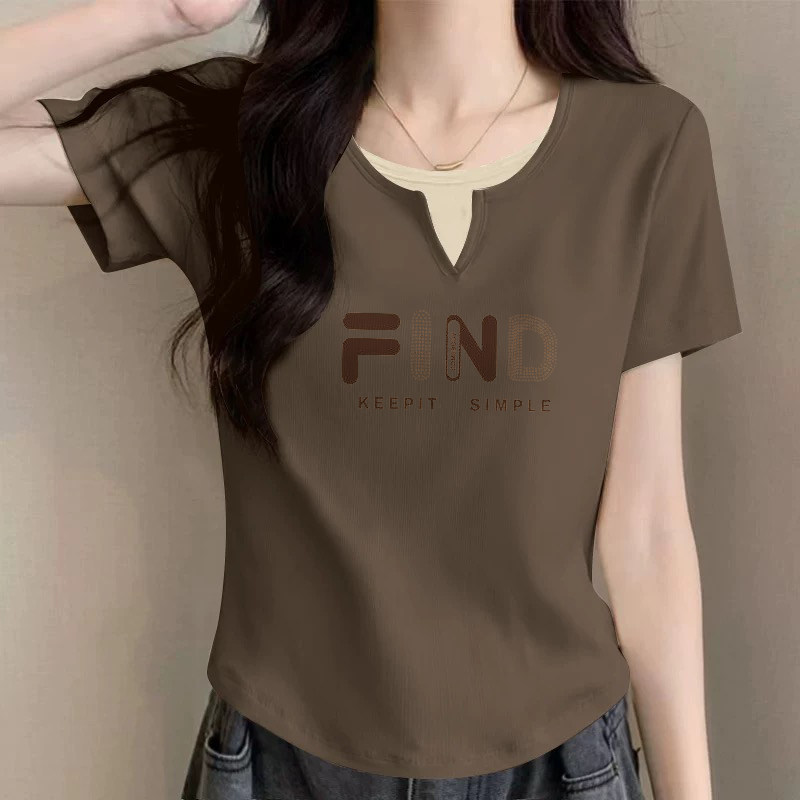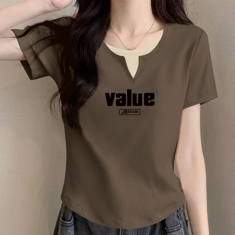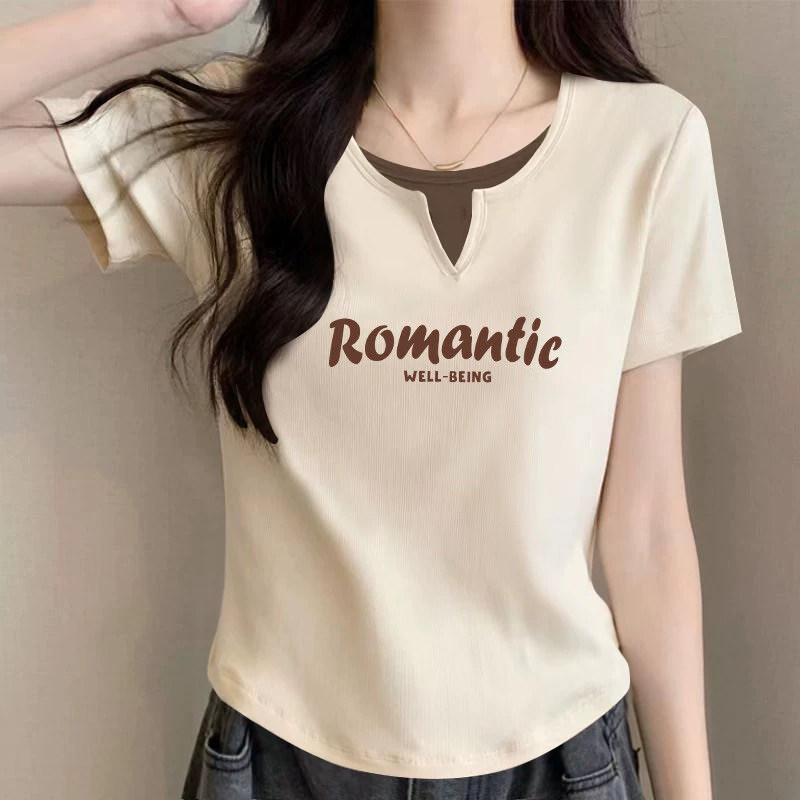 洋气减龄显瘦纯棉短袖T恤女文艺宽松撞色百搭气质休闲假两件上衣