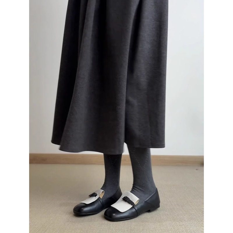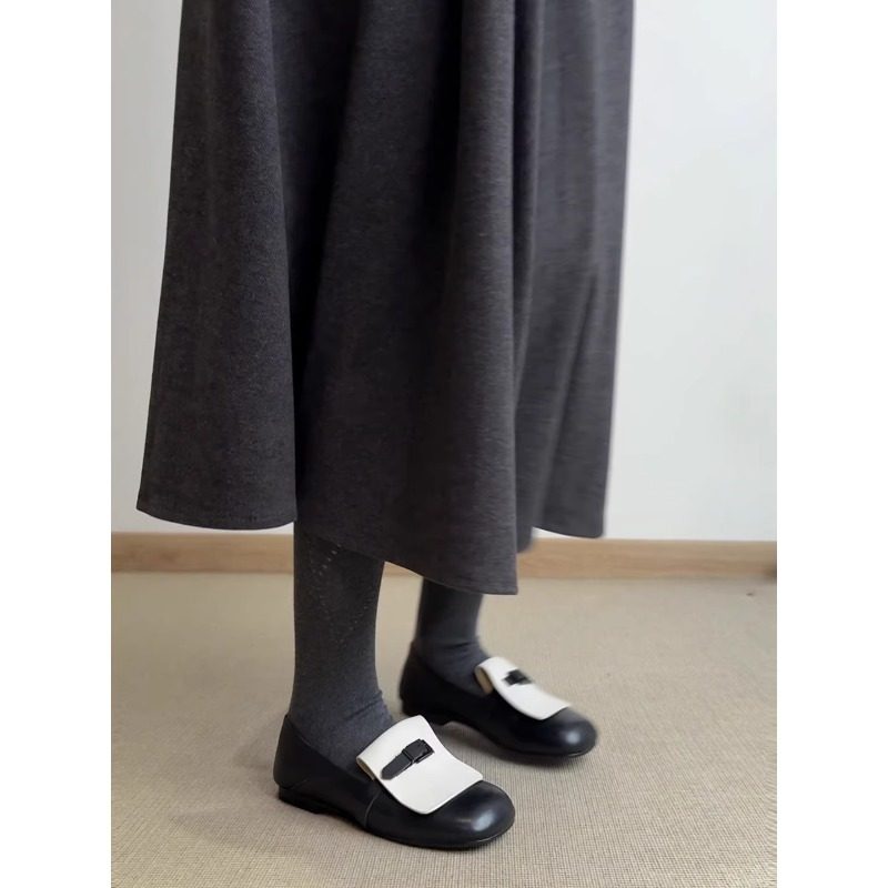 真皮方头英伦拼色平底豆豆鞋女