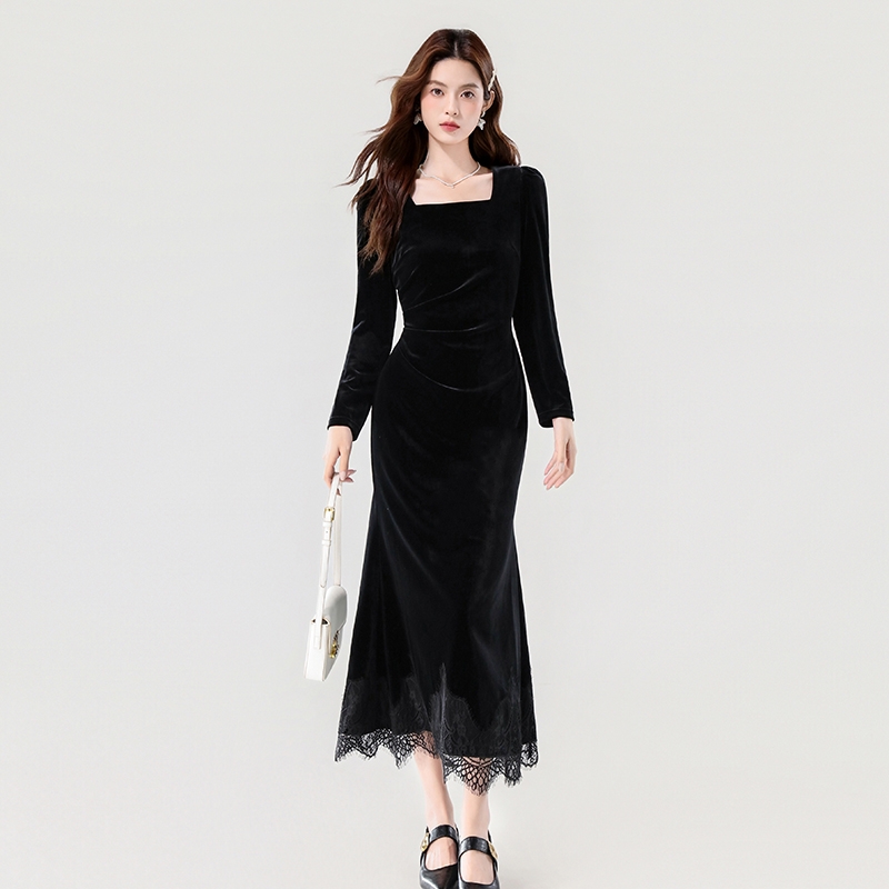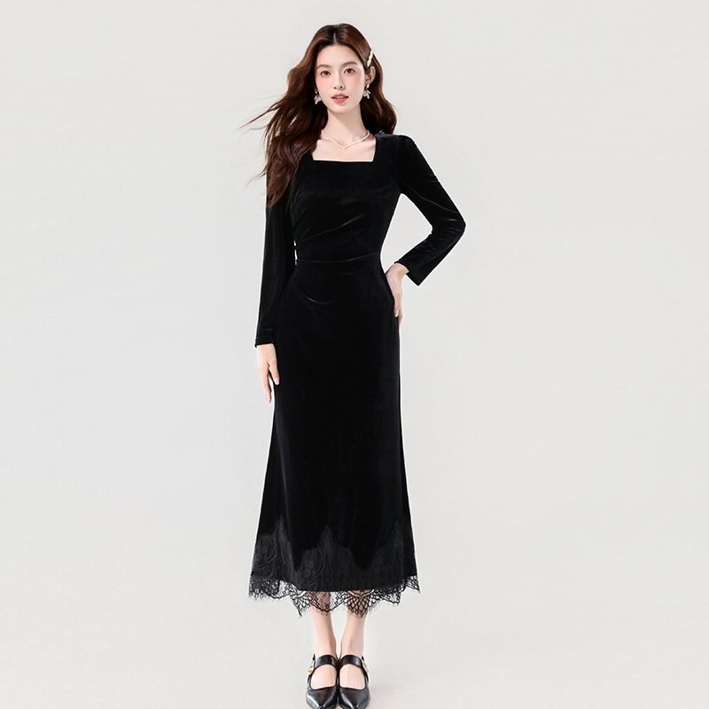 慵懒范秋新款方领简约精致优雅小女人收腰显瘦蕾丝边丝绒连衣裙