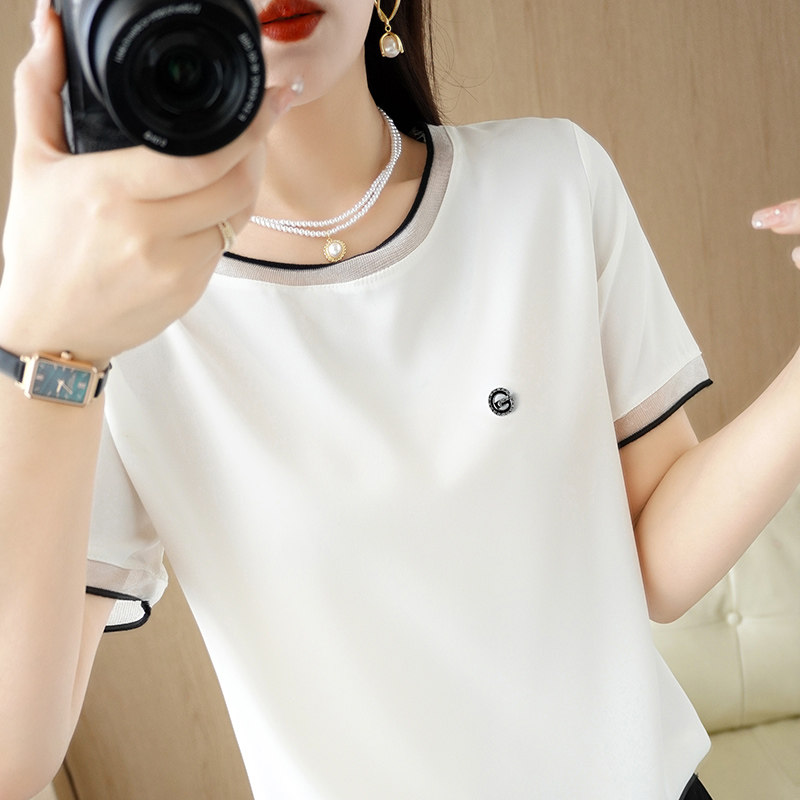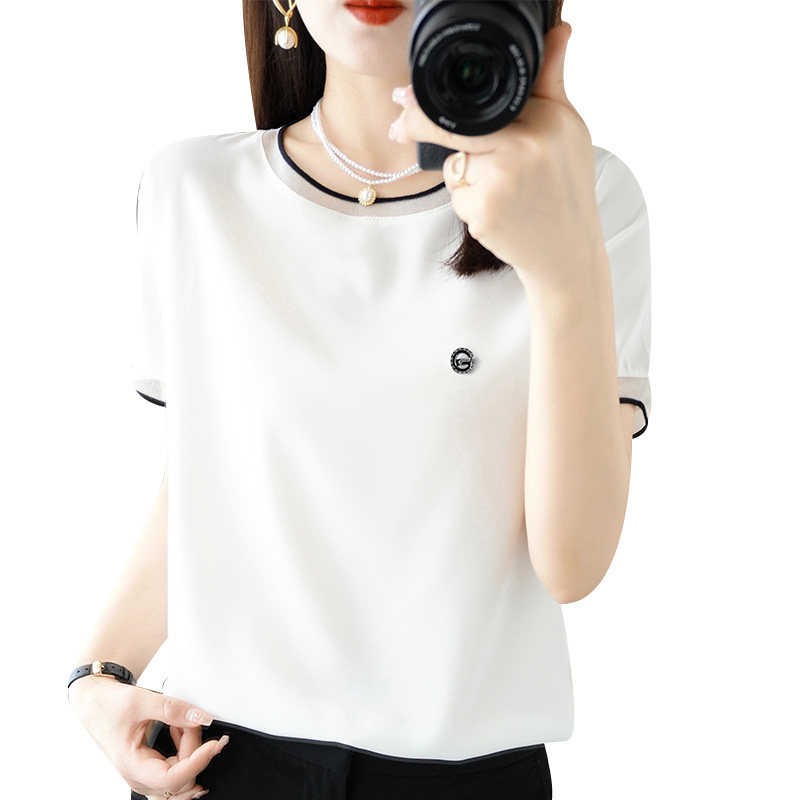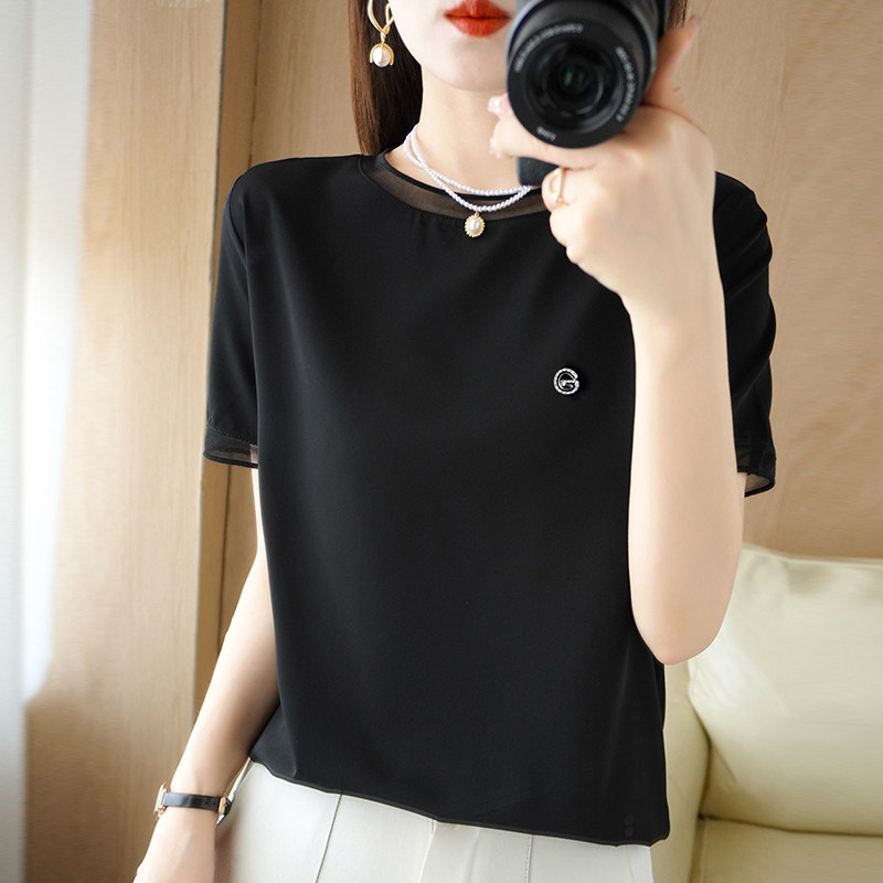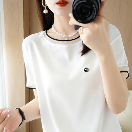 夏季高端真丝雪纺衫蕾丝短袖T恤女2023年新款短袖宽松显白上衣