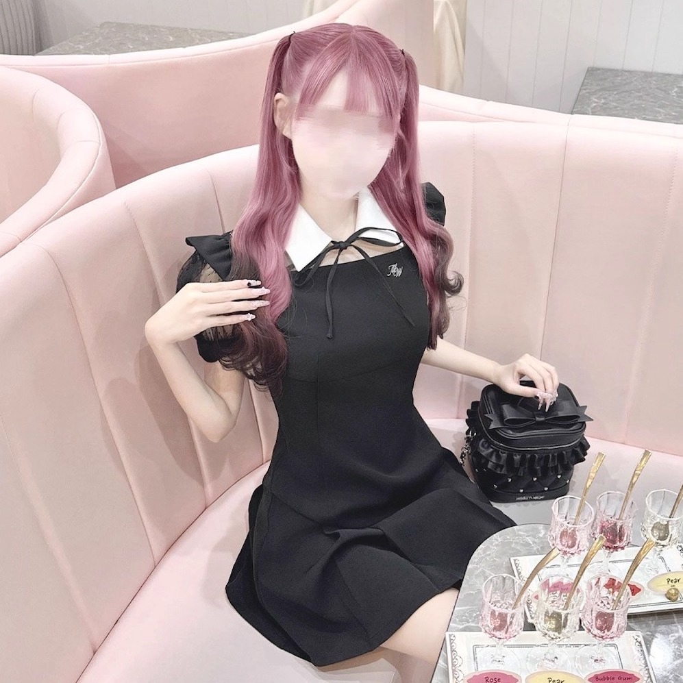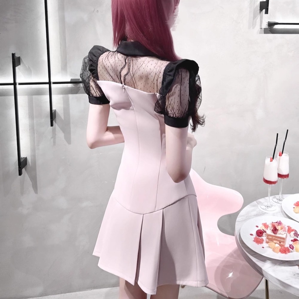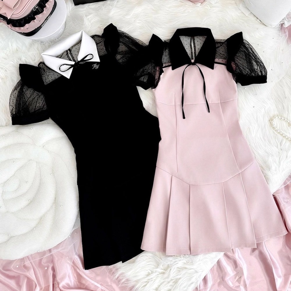 H. 日系甜美 波点薄纱拼接 拼色系带小白领 收腰显瘦短袖连衣裙