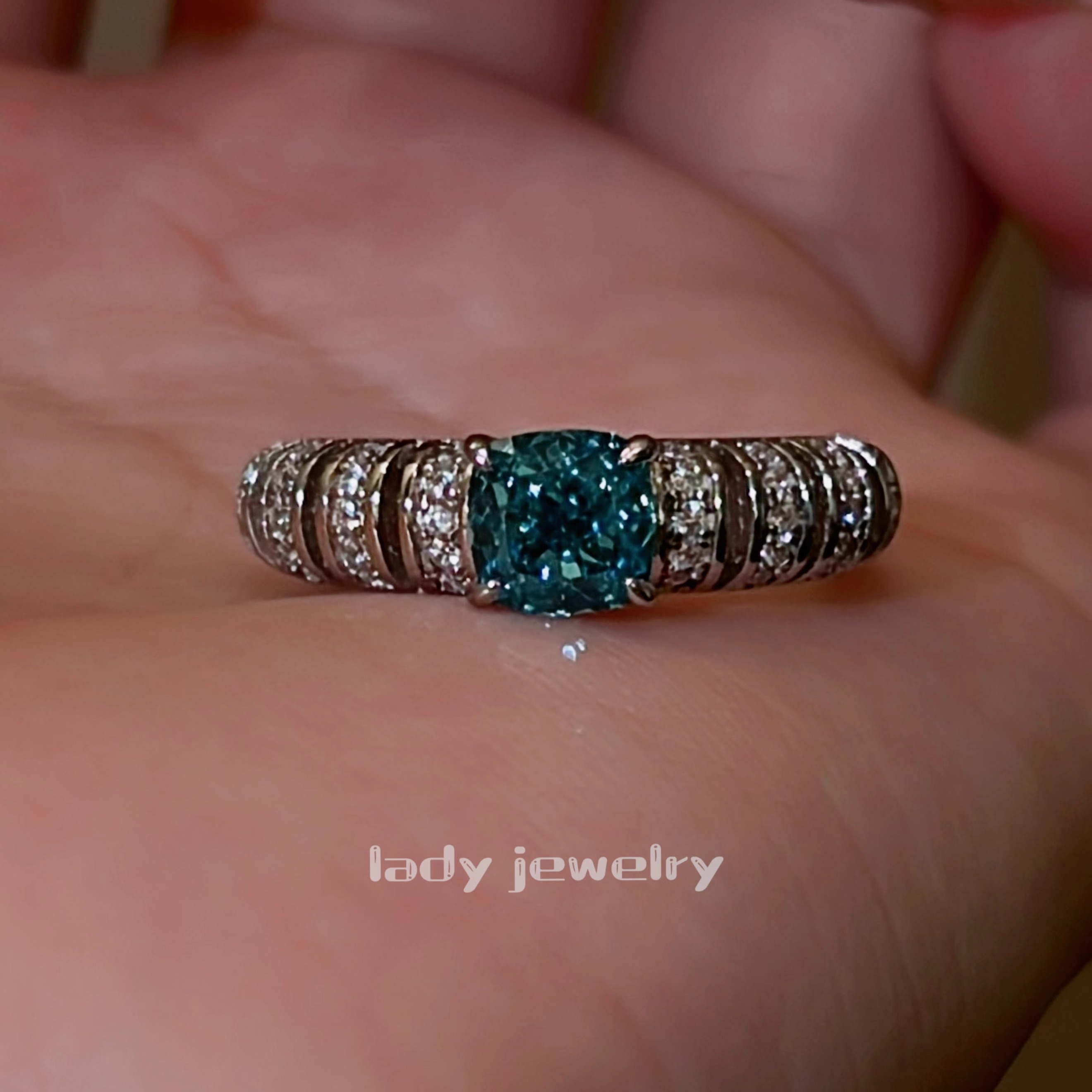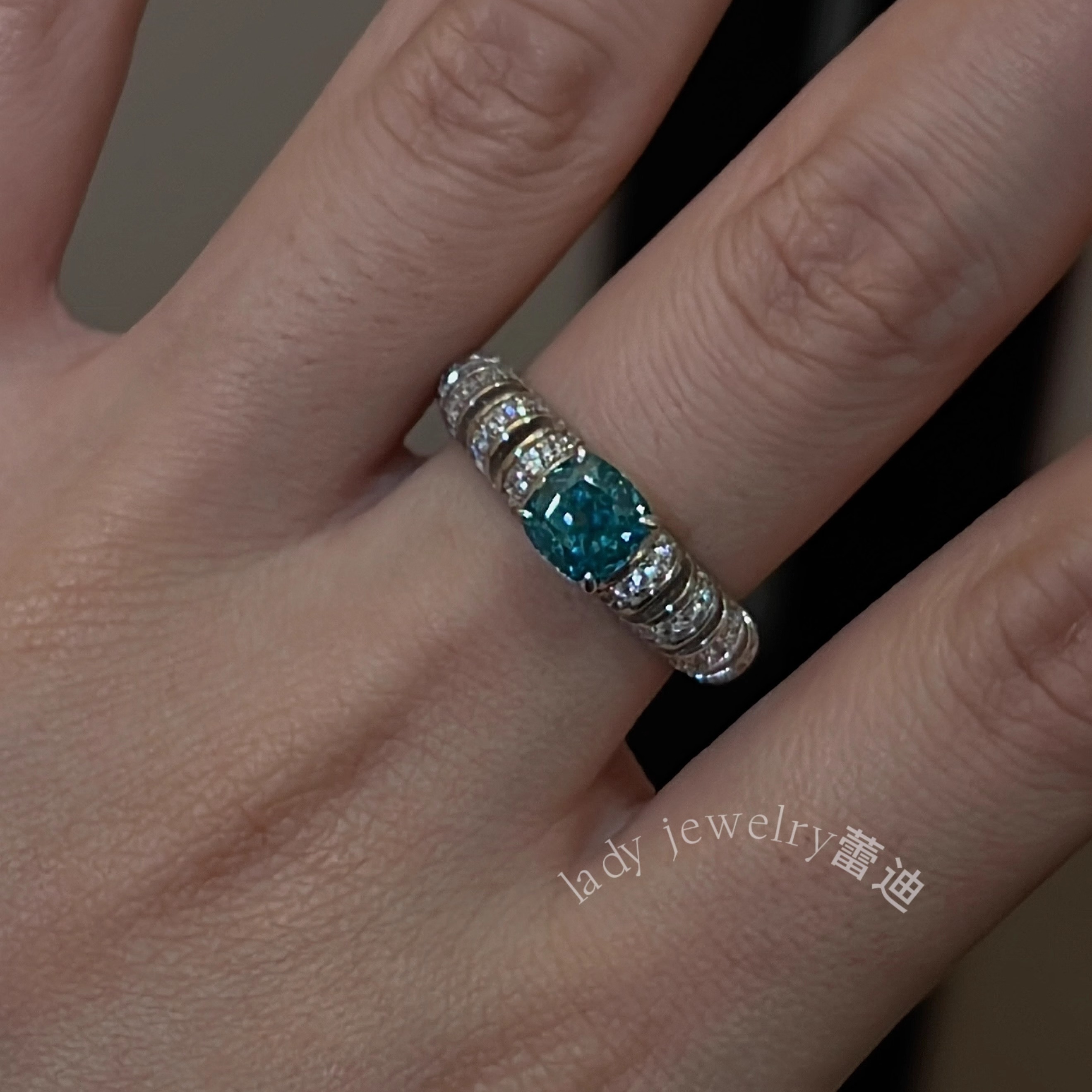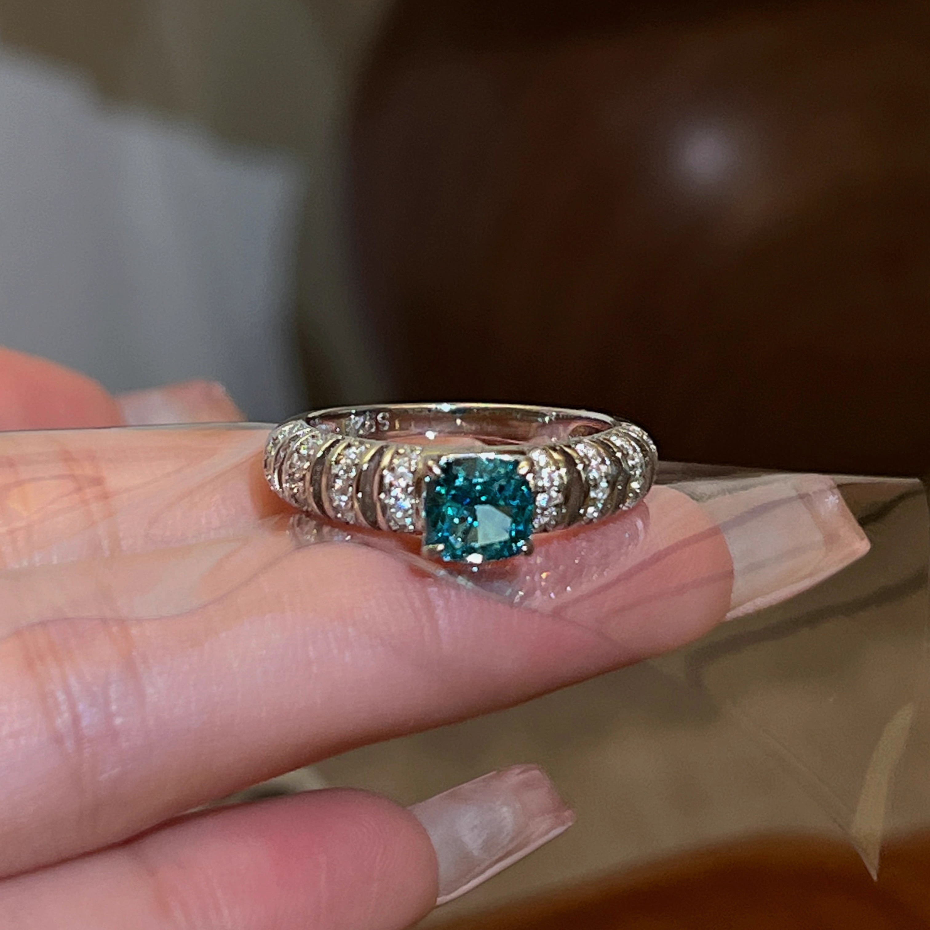 蕾迪高定帕拉伊巴霓虹蓝绿s925银镀真金1克拉方钻戒指