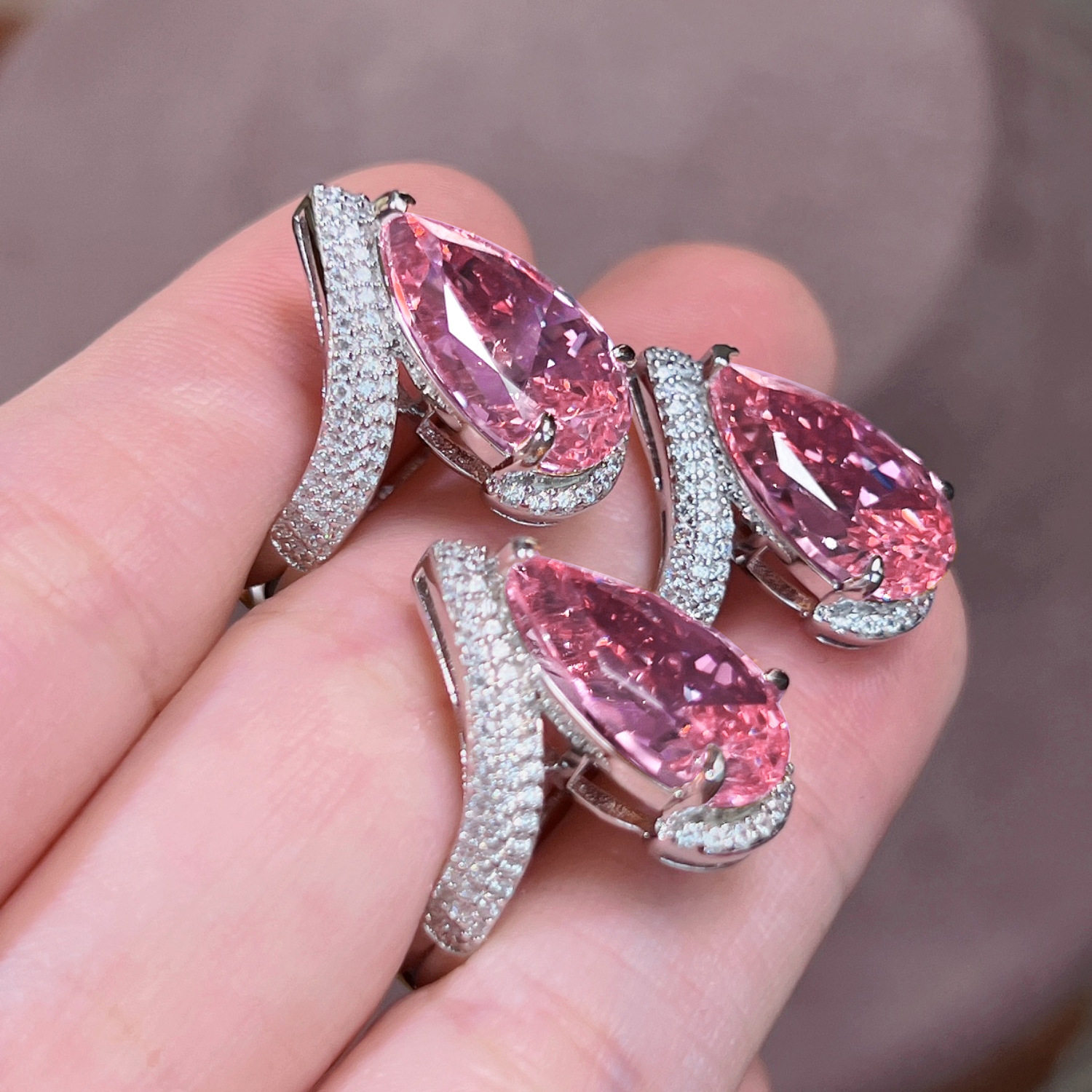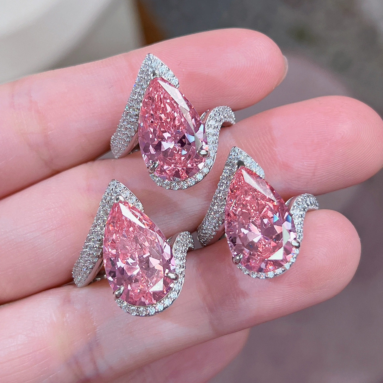 欧美结婚钻戒高端水滴形粉锆石镶满钻少女简约甜美高级感镀金戒指