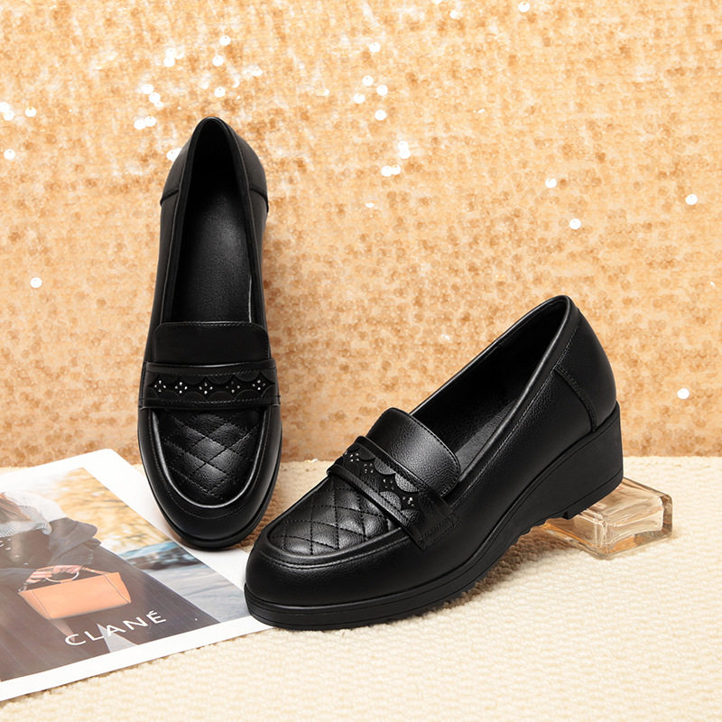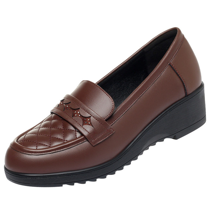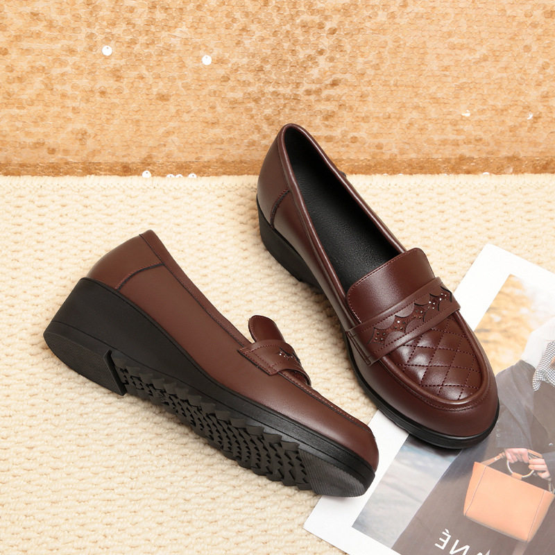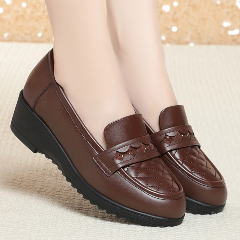 平底单鞋女秋季新款坡跟女鞋软皮软底中老年妈妈鞋子舒适棕色皮鞋