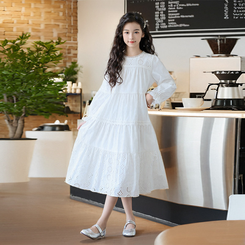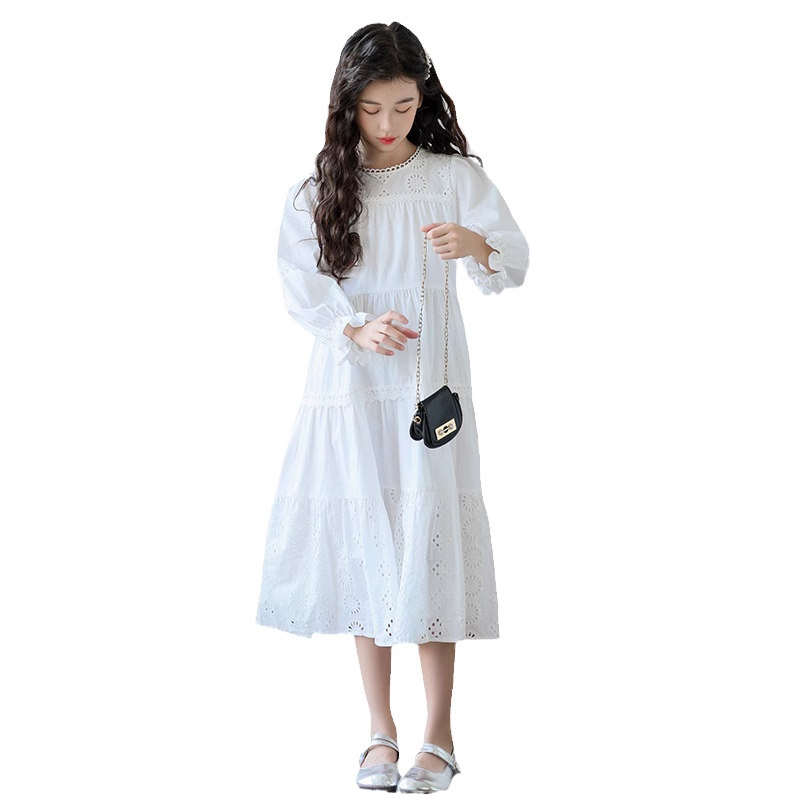 女童白色连衣裙秋装新款高级感中大童纯棉长袖镂空裙子洋气公主裙